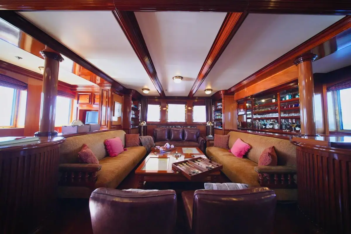 STEEL's interior features Cuban mahogany wood and beautiful Dutch marble bathrooms. The main saloon, with its fully equipped gentlemen's bar, can also be transformed into a cinema room. The dining area has high ceilings and an opulent chandelier, and the upper deck has a further dining room with pantry. Accommodation comprises of master cabin mid-ship on the main deck, a double guest cabin with an additional pullman berth on the boat deck and four twin cabins on the lower deck, each with pullman berths. There is a further nanny/ children's cabin with additional pullman berth on the lower deck (which could be used for staff or guests dependent on owner's requirements).