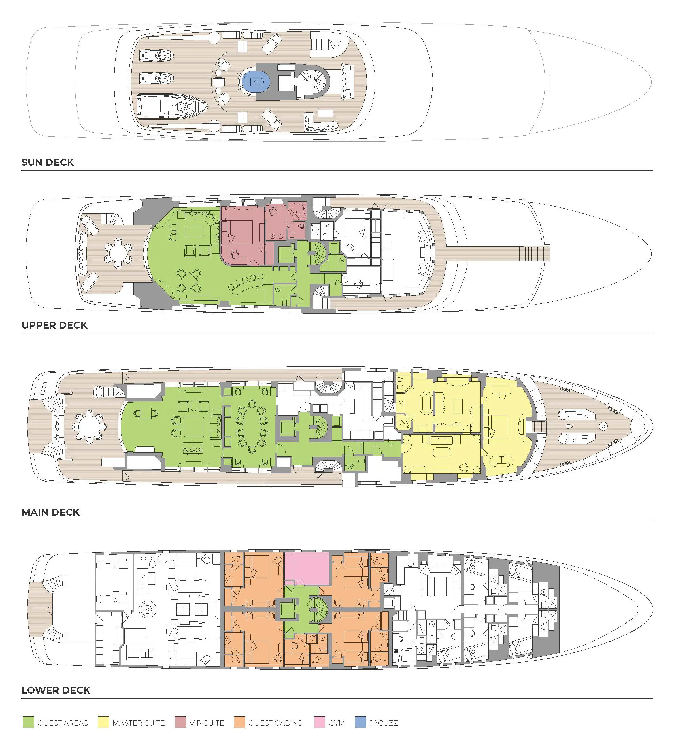 AMANTI has a split-level sun deck. The aft section serves as a boat deck on passage, complete with deck crane to launch the tender and two waverunners. Four steps lead up to the forward section where there is exercise equipment and a jacuzzi to the rear of the mast. Moving forward there is an al fresco lounge to starboard, a wet bar to port and a central forward-facing observation bench. The base of the radar mast conceals a spiral staircase to the bridge deck and an elevator that serves all guest decks.
