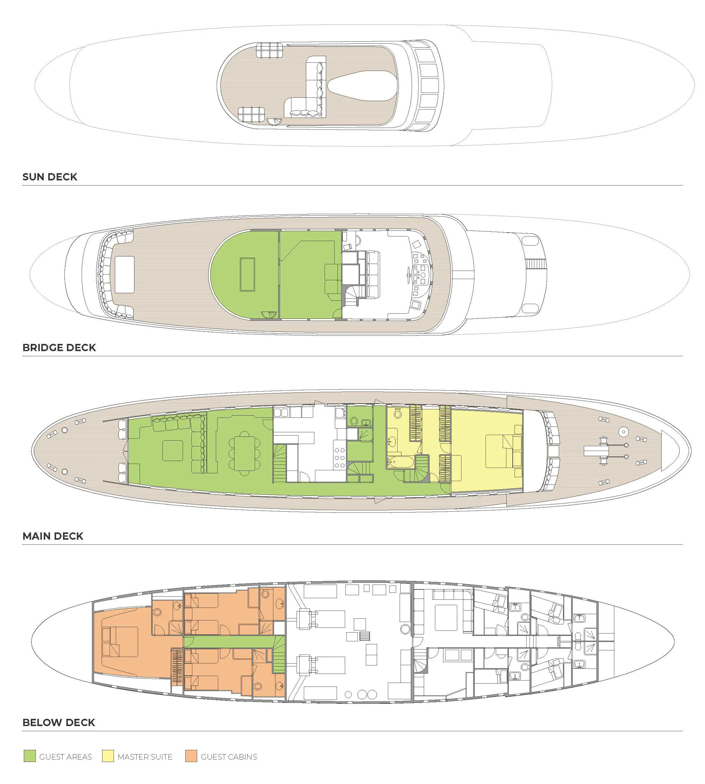 The main deck aft has four large rattan armchairs around a coffee table in ample shade. Inside, her interior decor is traditional, with finely crafted features. The main deck saloon has a large lounge area aft with L-shaped sofas and two armchairs and forward is the formal dining area with an eight-seat table. The sky lounge has a large sofa facing aft, looking through double doors opening onto the upper aft deck.