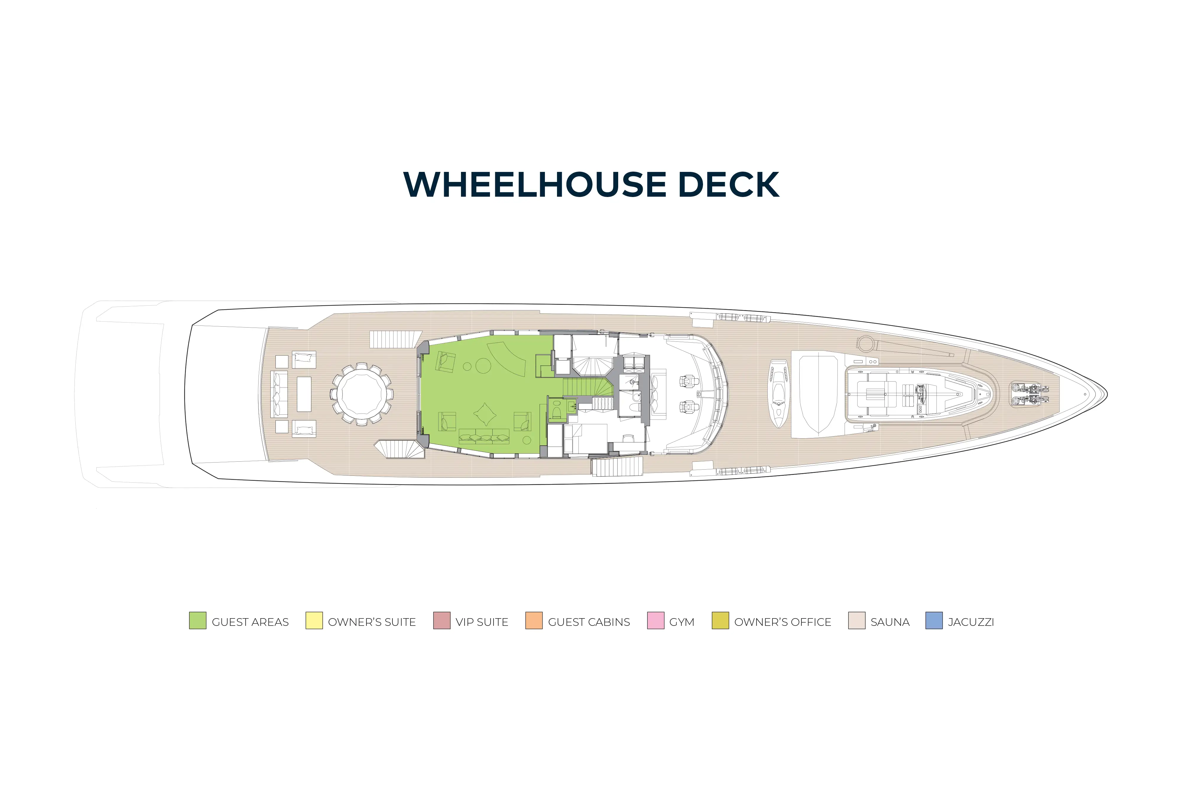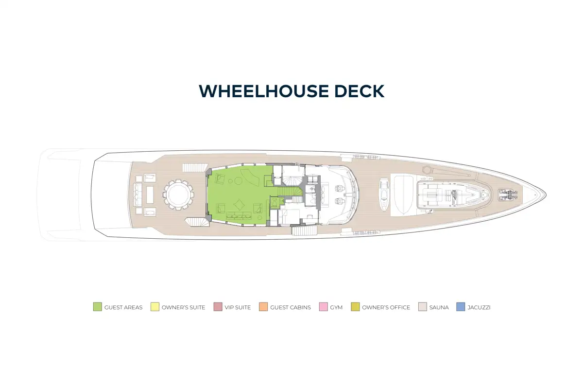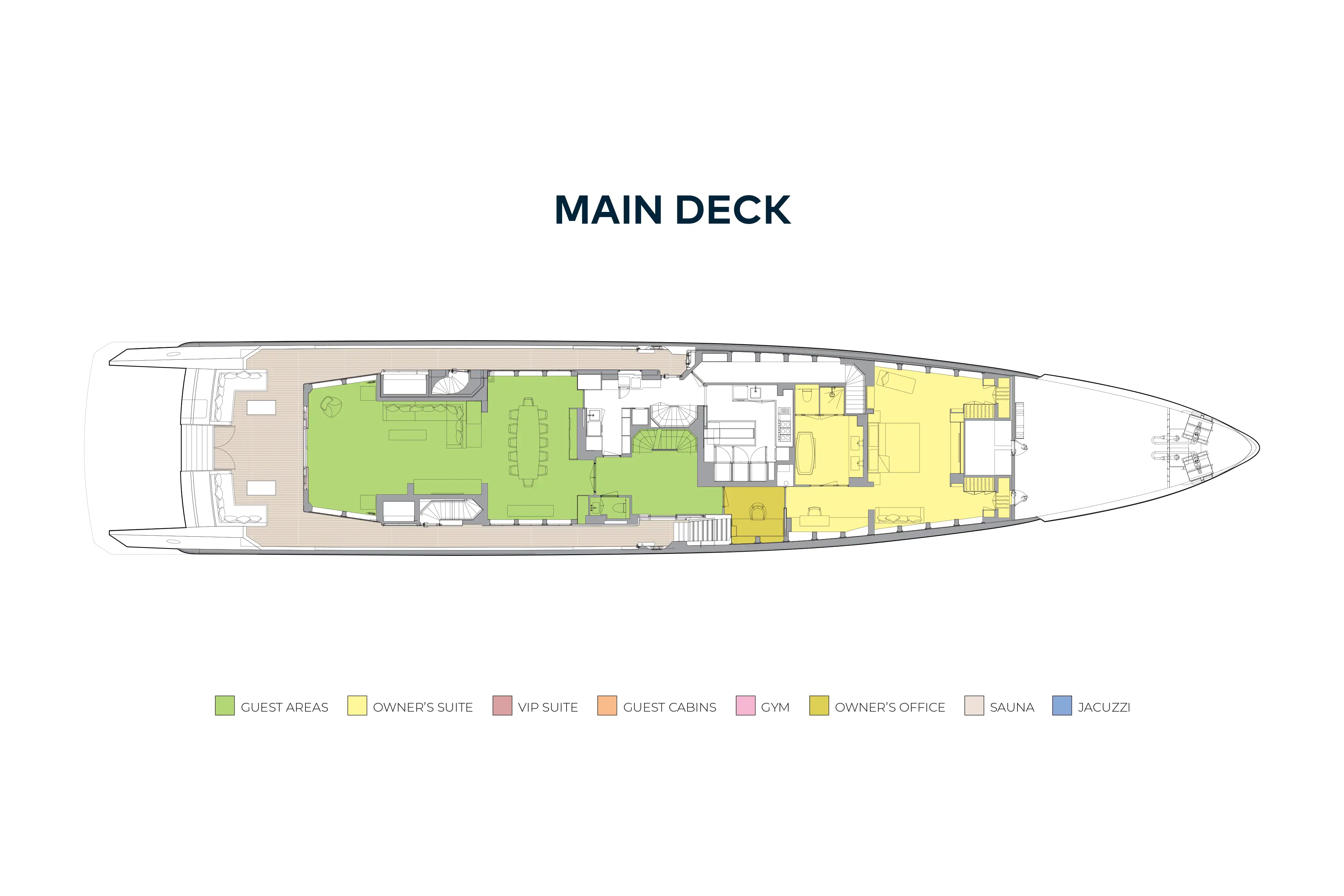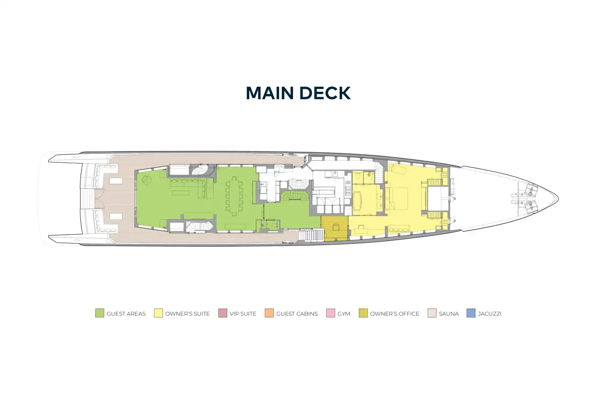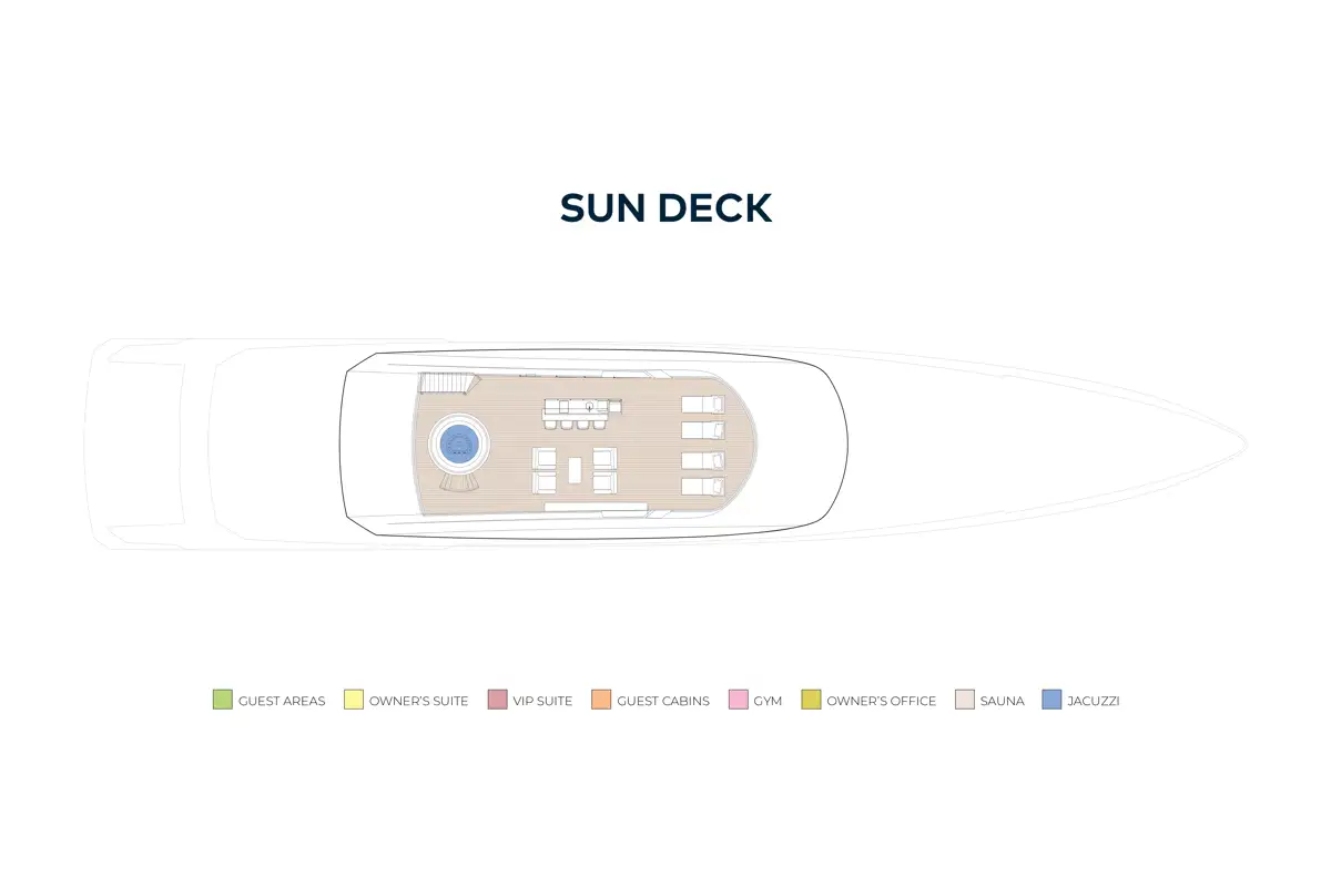 A large sun deck has sun loungers forward with privacy glass safety screens. Beneath the hardtop is a large sit-up bar to port and a lounge area to starboard, which could convert into a dining area. Aft is a jacuzzi. The upper deck aft has open air dining shaded by the overhang and a sun lounge aft, and walkaround sidedecks lead to the foredeck. The main deck aft has L-shaped banquettes port and starboard around coffee tables and a central staircase leads down to a huge swim platform that doubles as a sea level sun lounge. Behind a door, steps lead to an air conditioned gym and dayhead.