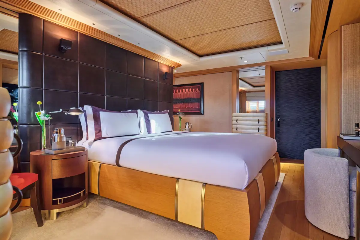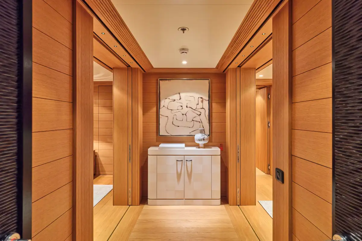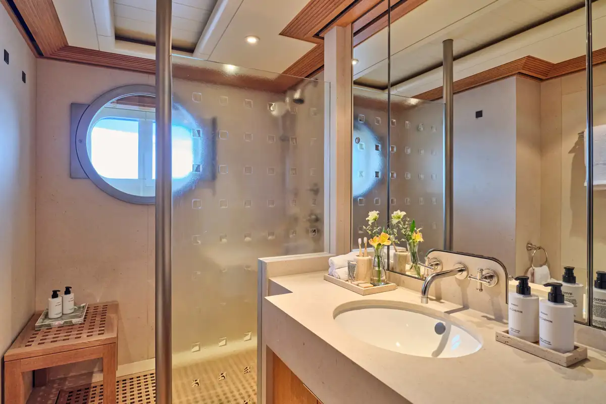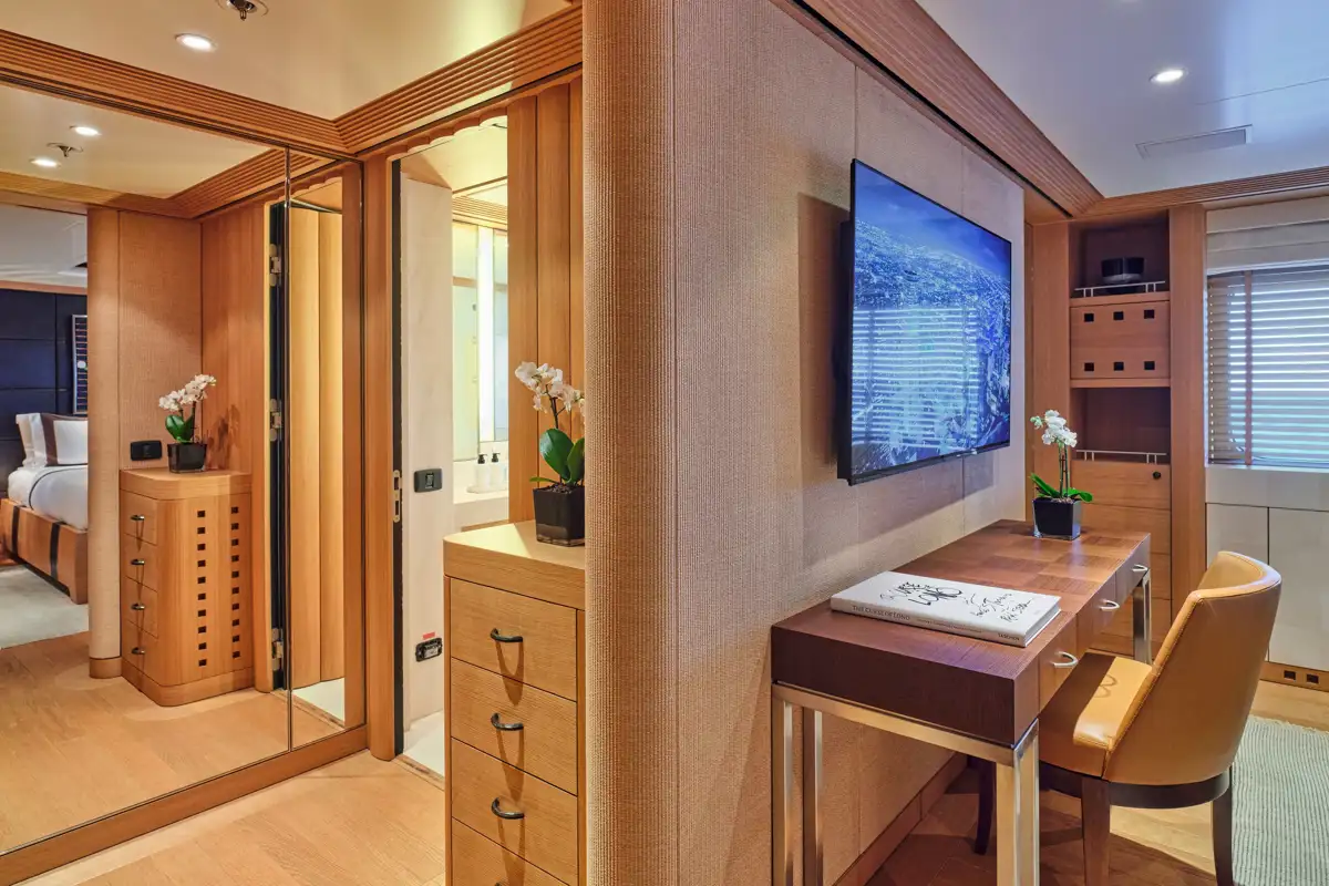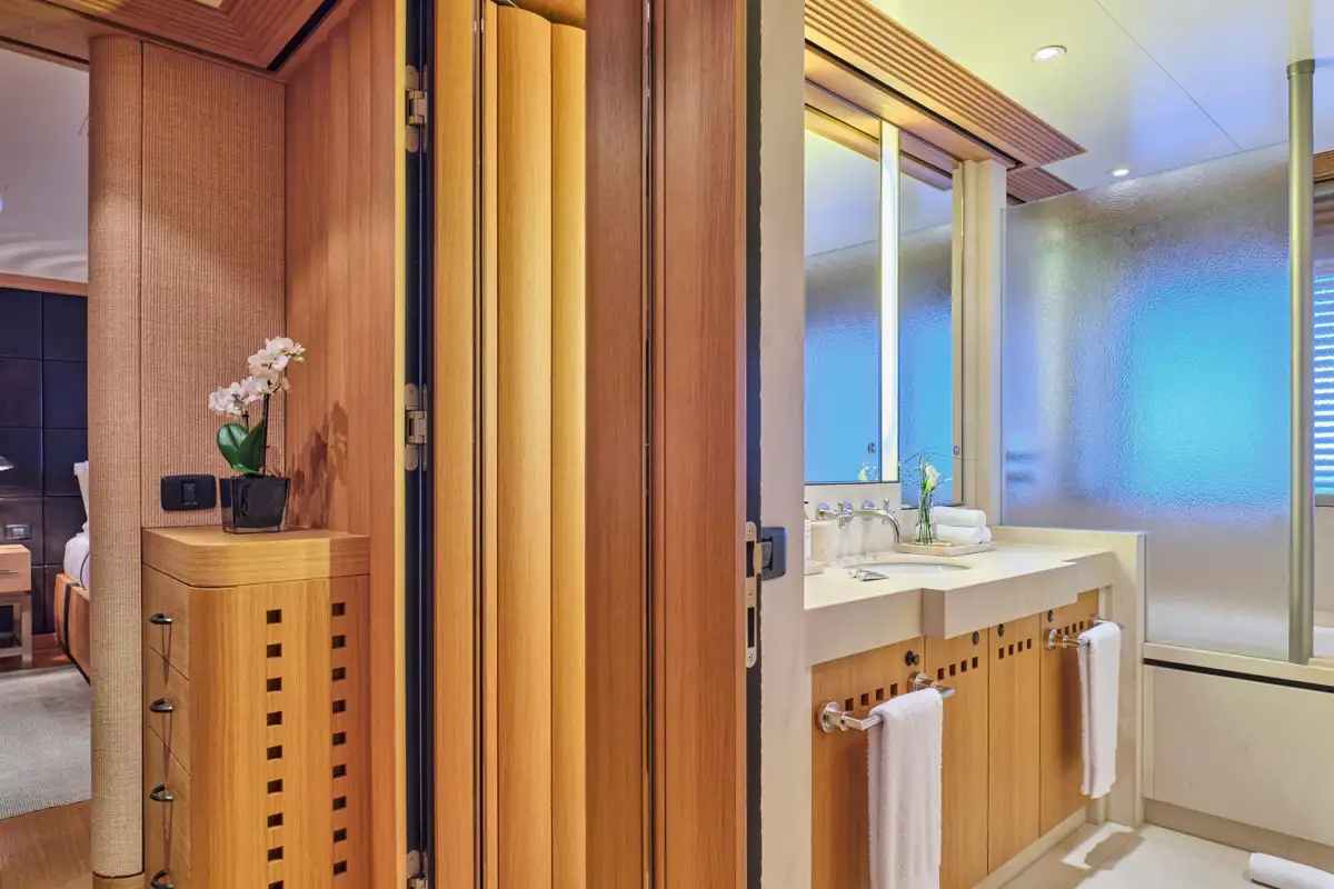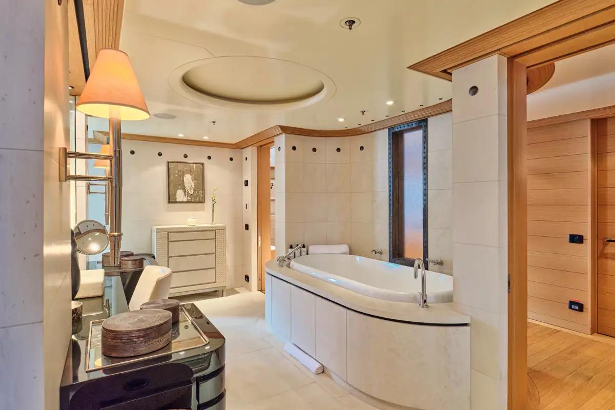 The spacious owner’s suite is forward on the main deck. The bedroom is to starboard and there is a lounge-study area to port with his and hers walk-in wardrobes and a bathroom forward with his and hers wash and shower facilities and a shared bath. She has two double cabins on the main deck and, on the lower deck, two further double cabins and two twin cabins complete versatile accommodation for 14, attended to by up to 21 crew.