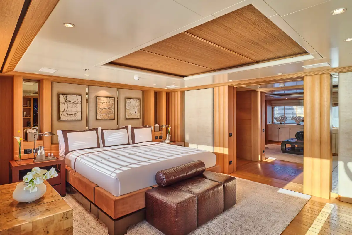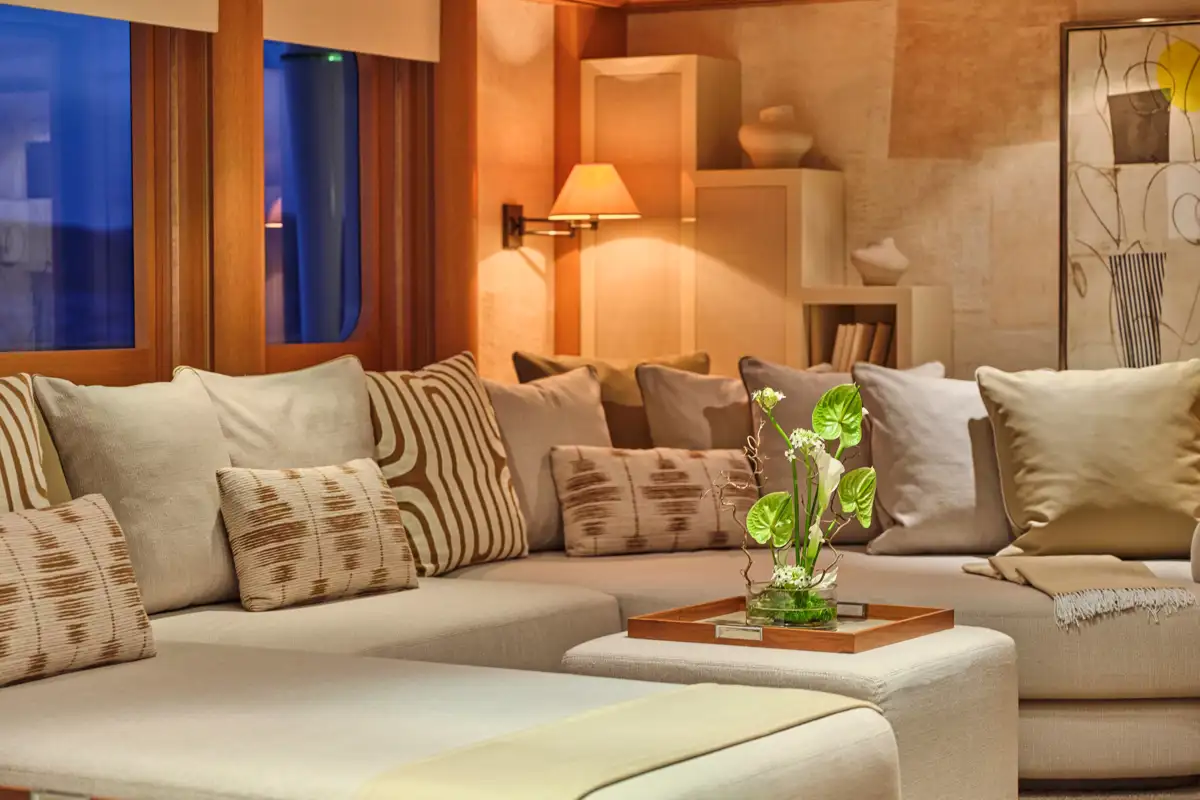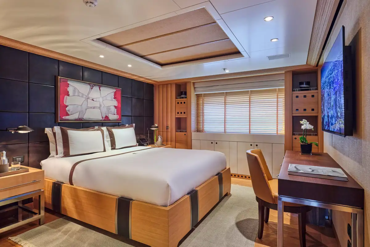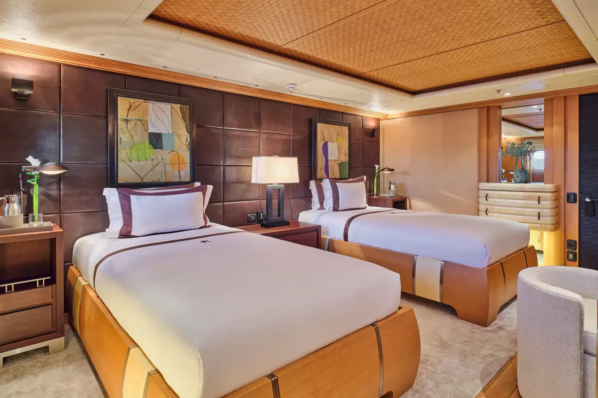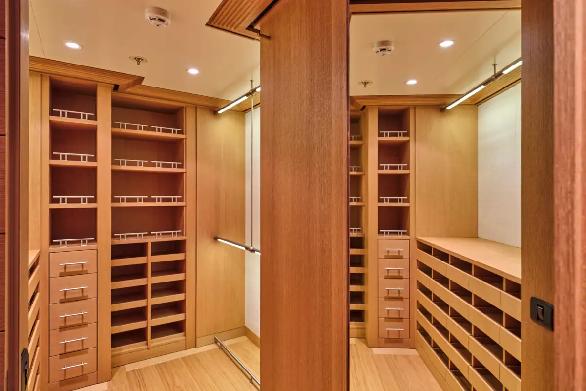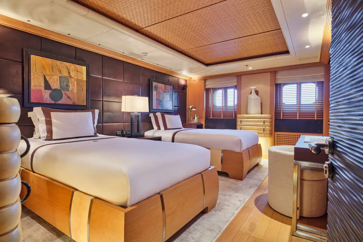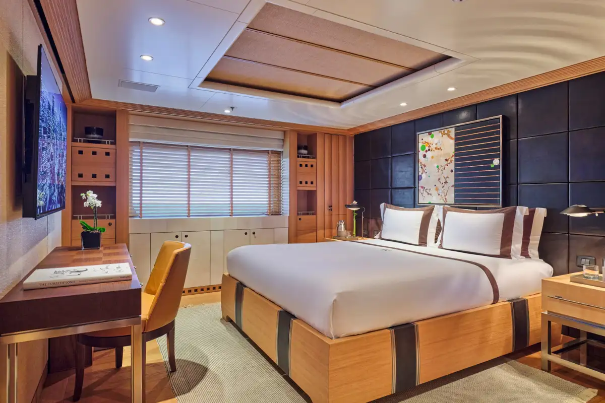 The spacious owner’s suite is forward on the main deck. The bedroom is to starboard and there is a lounge-study area to port with his and hers walk-in wardrobes and a bathroom forward with his and hers wash and shower facilities and a shared bath. She has two double cabins on the main deck and, on the lower deck, two further double cabins and two twin cabins complete versatile accommodation for 14, attended to by up to 21 crew.