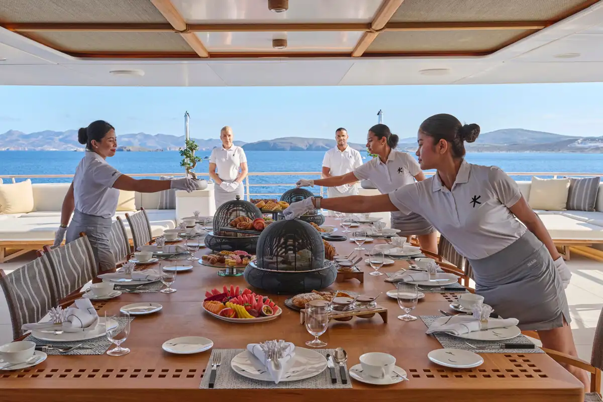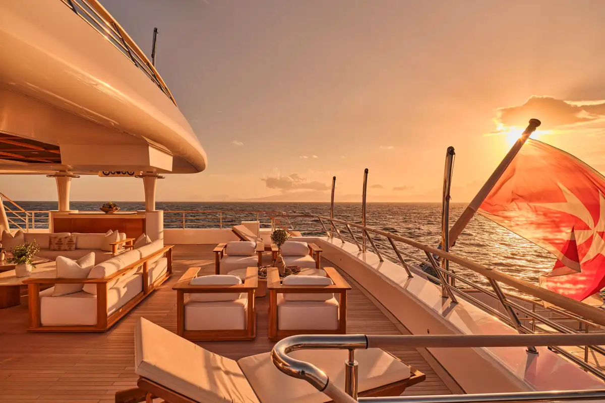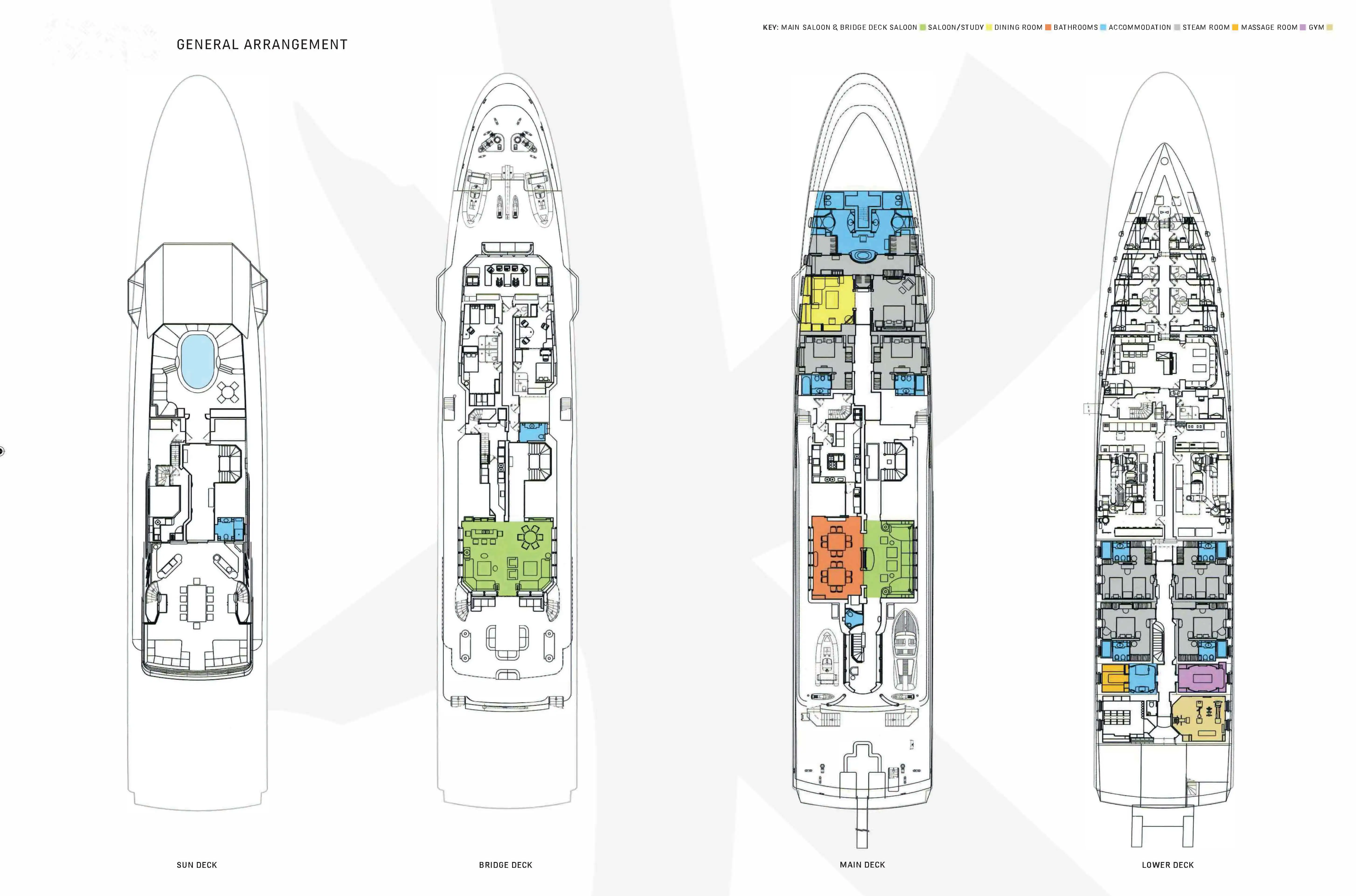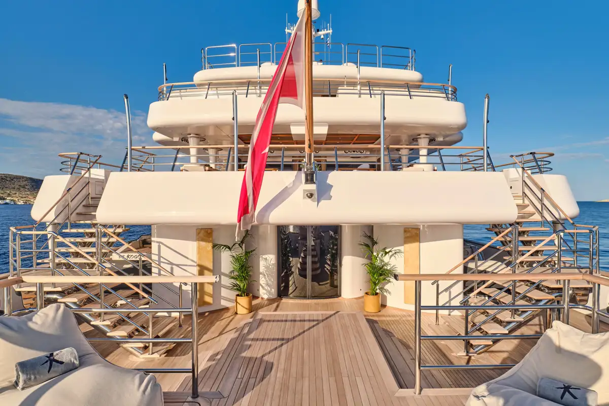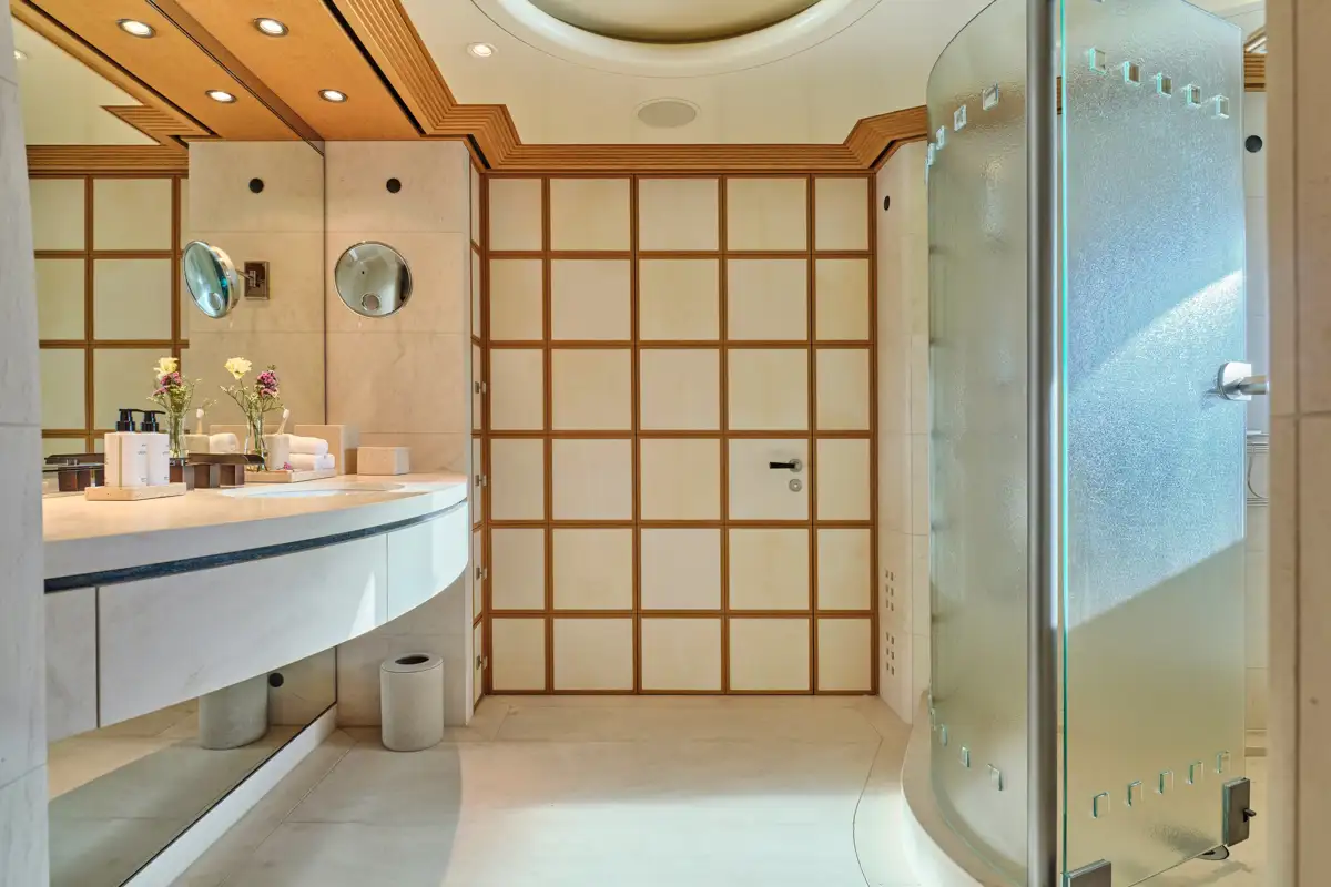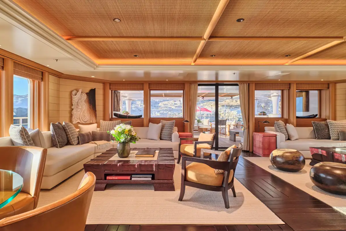 The spacious owner’s suite is forward on the main deck. The bedroom is to starboard and there is a lounge-study area to port with his and hers walk-in wardrobes and a bathroom forward with his and hers wash and shower facilities and a shared bath. She has two double cabins on the main deck and, on the lower deck, two further double cabins and two twin cabins complete versatile accommodation for 14, attended to by up to 21 crew.