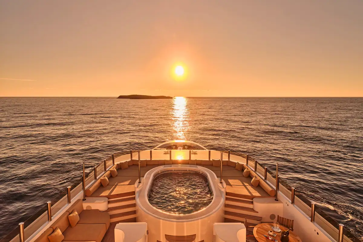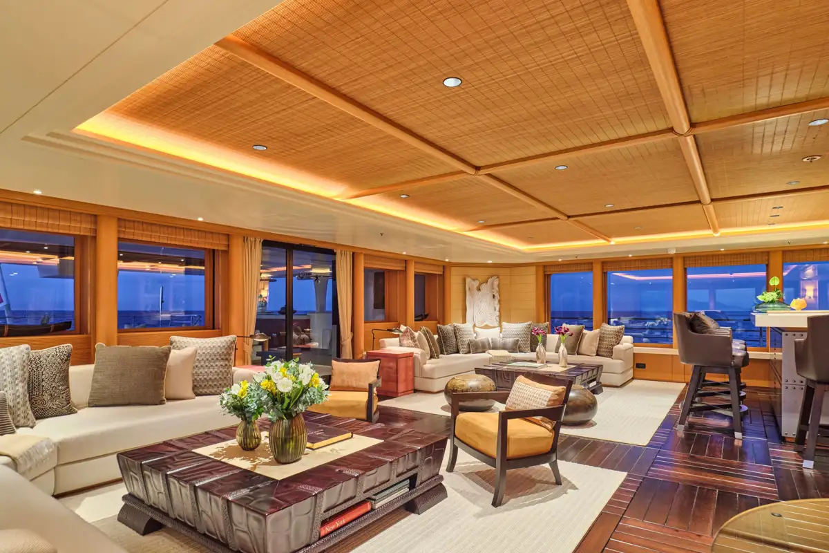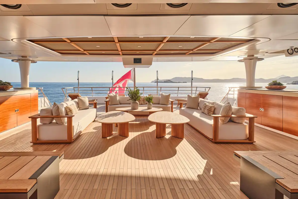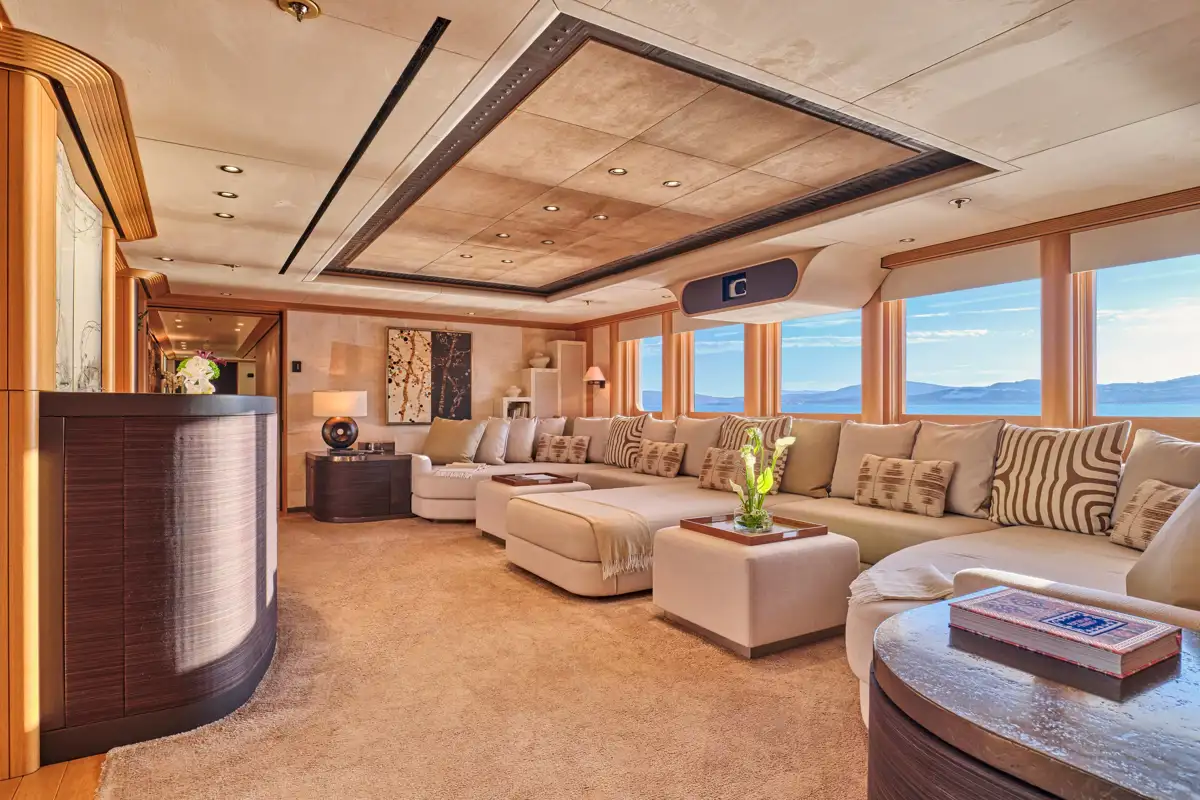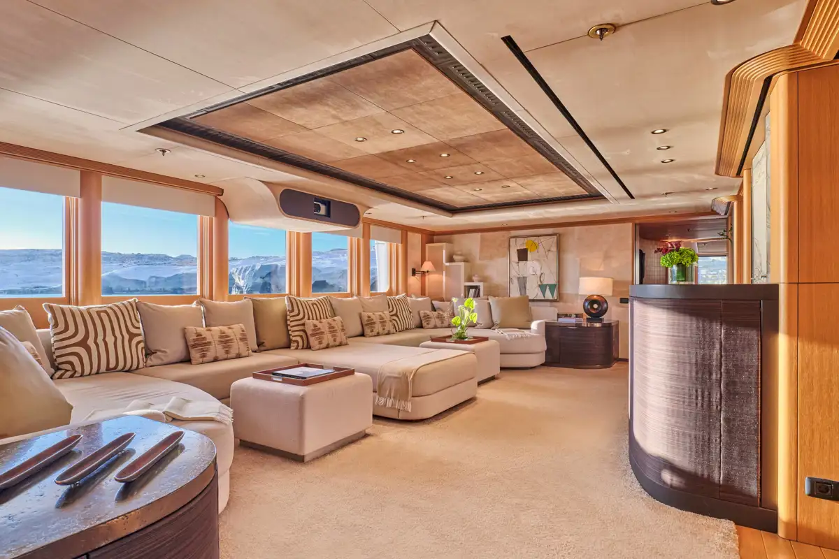 Her sun deck has a large jacuzzi forward flanked by sun pads and sheltered by glass screens, and aft there is an al fresco dining area with bar, sheltered by sliding screens either side and more sun pads aft. Her bridge deck saloon offers a variety of social spaces with a bar, gaming table and lounge area, with sliding glass doors opening out onto a large sun lounge for relaxation or entertainment. This space also doubles as an outdoor cinema with world class Dolby surround sound.
