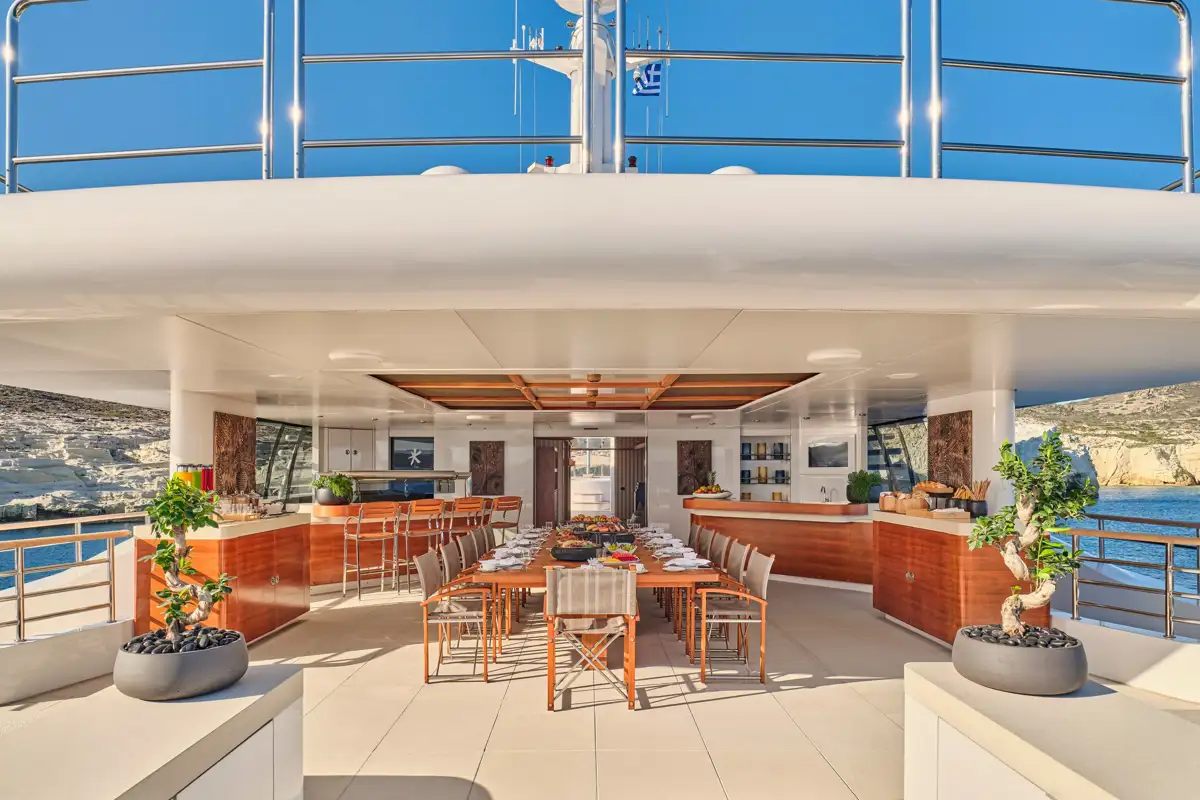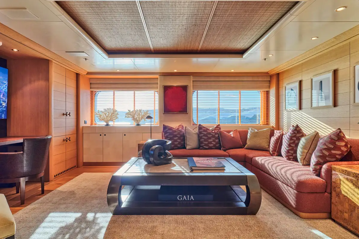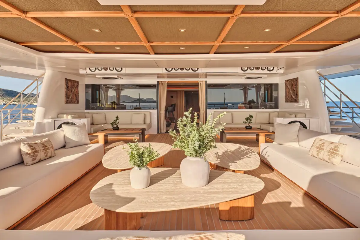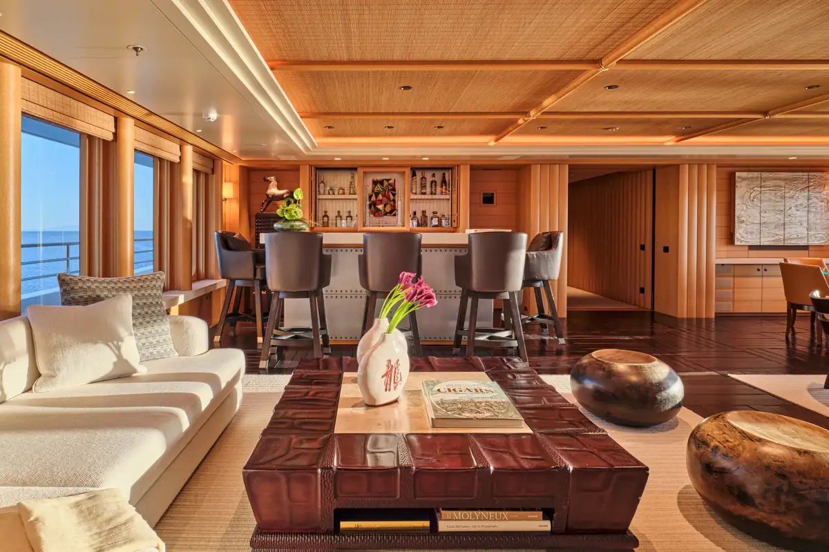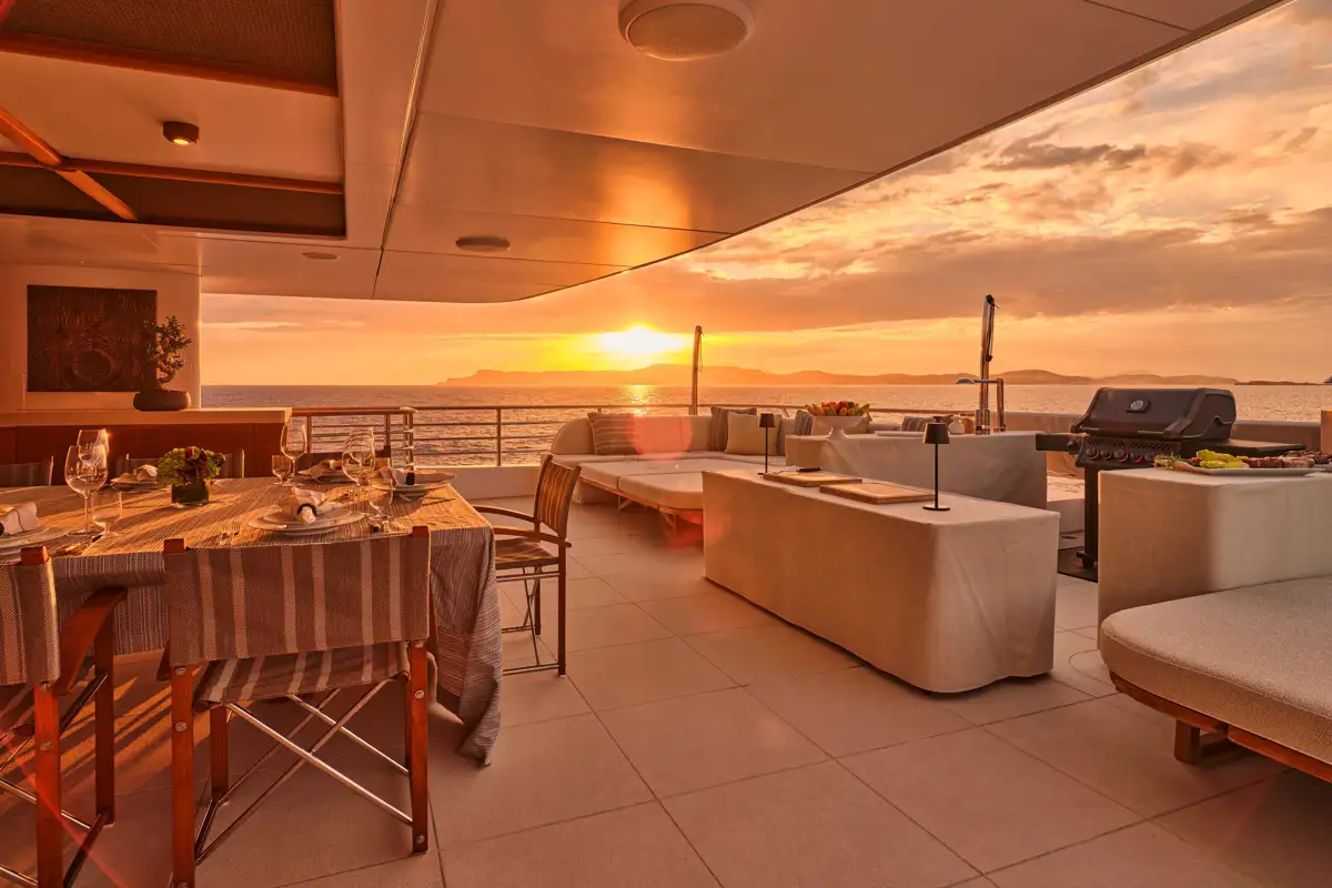 Her sun deck has a large jacuzzi forward flanked by sun pads and sheltered by glass screens, and aft there is an al fresco dining area with bar, sheltered by sliding screens either side and more sun pads aft. Her bridge deck saloon offers a variety of social spaces with a bar, gaming table and lounge area, with sliding glass doors opening out onto a large sun lounge for relaxation or entertainment. This space also doubles as an outdoor cinema with world class Dolby surround sound.