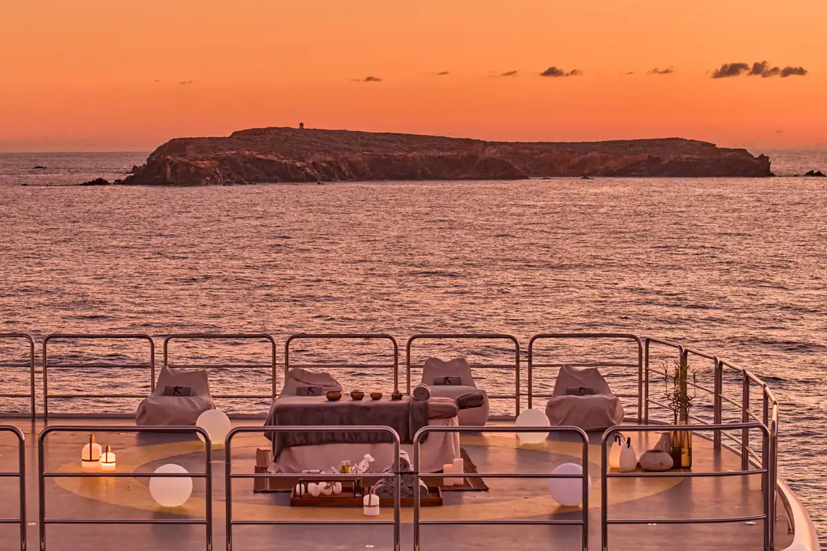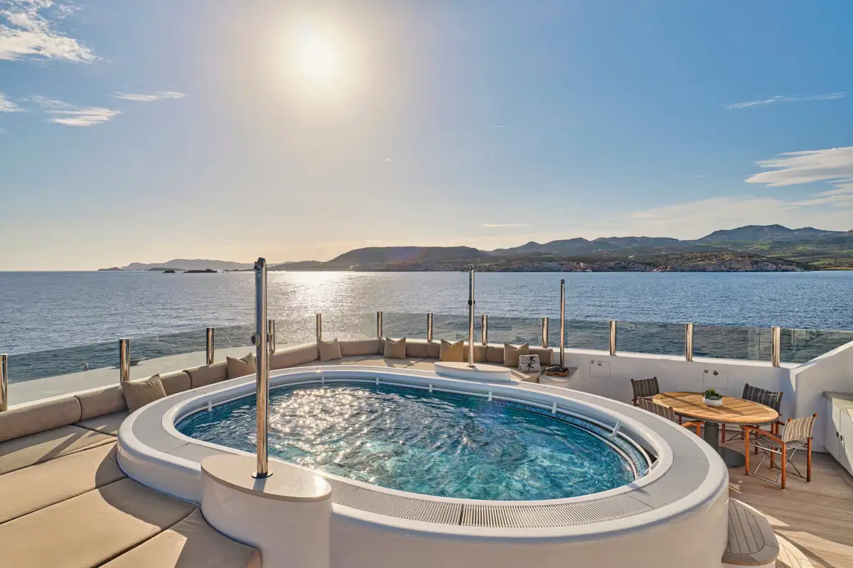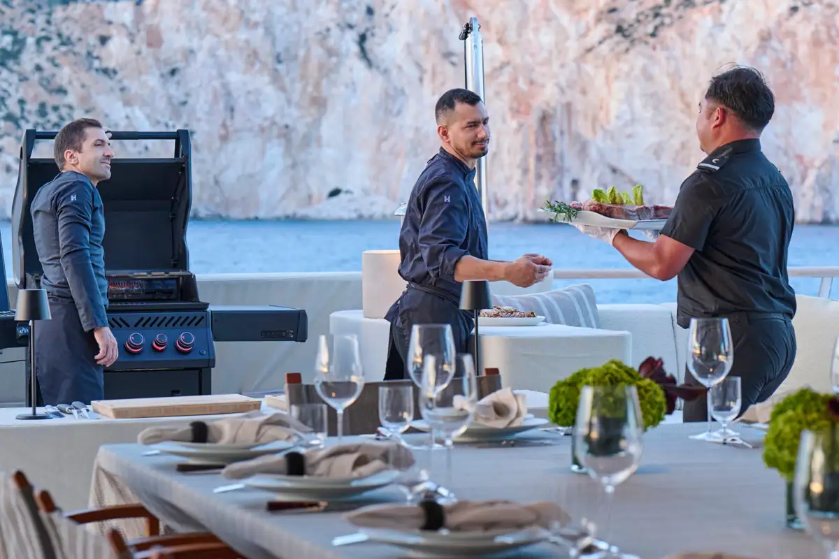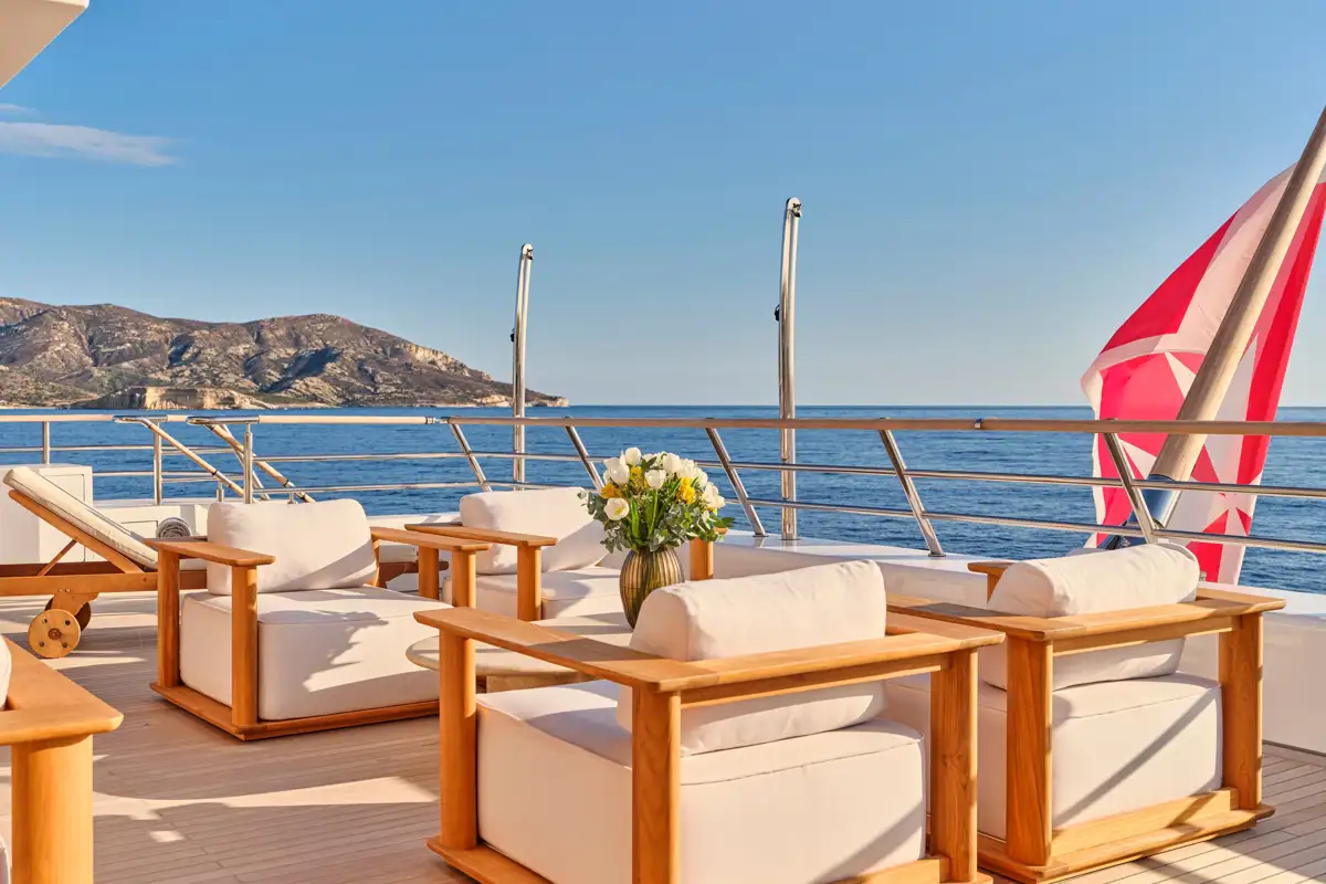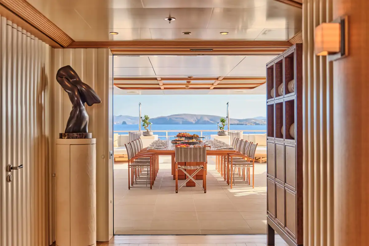 Her sun deck has a large jacuzzi forward flanked by sun pads and sheltered by glass screens, and aft there is an al fresco dining area with bar, sheltered by sliding screens either side and more sun pads aft. Her bridge deck saloon offers a variety of social spaces with a bar, gaming table and lounge area, with sliding glass doors opening out onto a large sun lounge for relaxation or entertainment. This space also doubles as an outdoor cinema with world class Dolby surround sound.