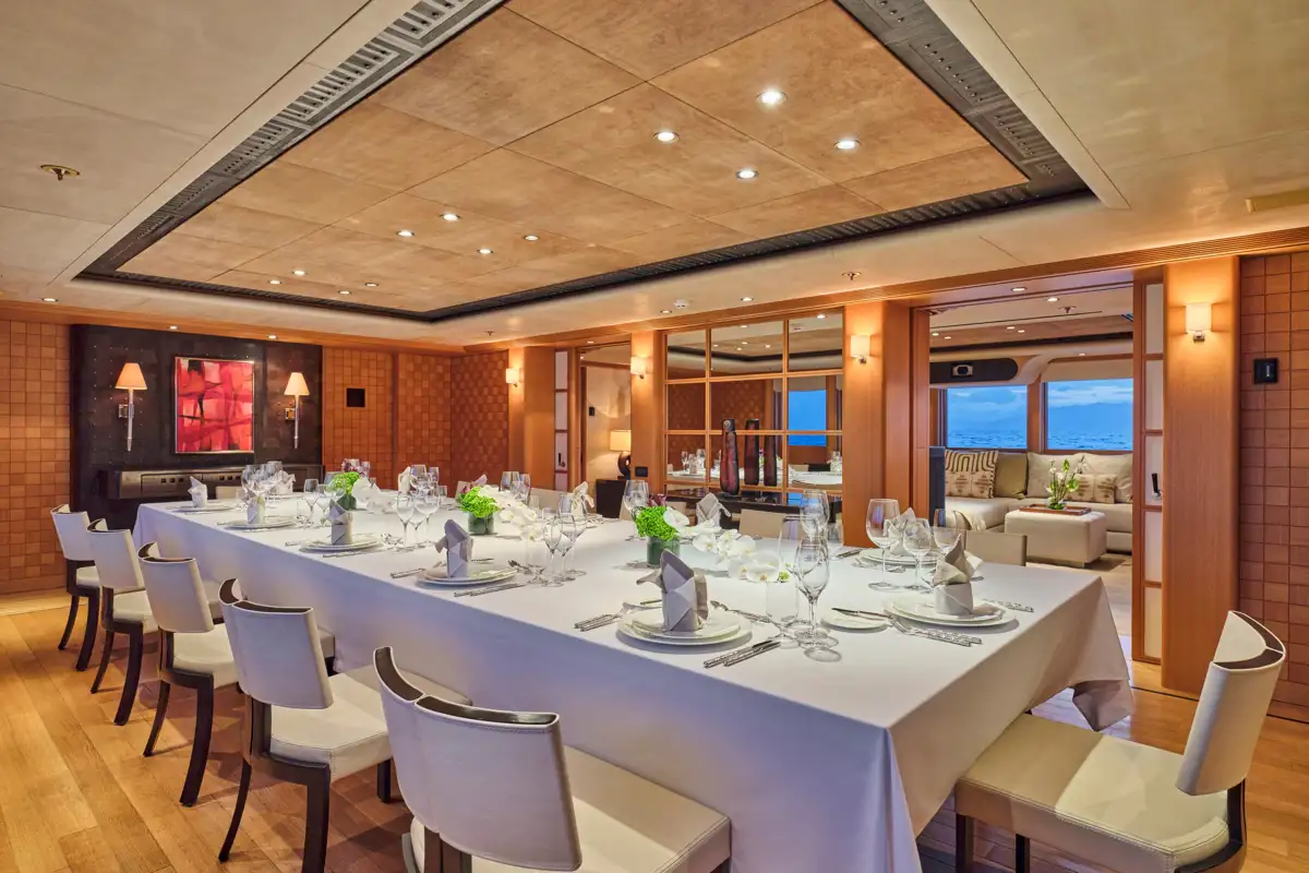Her main deck has a versatile formal dining room to port, seating two tables of eight or one table of 16, all enjoying excellent views out through large picture windows. To starboard is the main saloon, which doubles as a state-of-the-art entertainment centre with Dolby surround sound and a HD cinema screen. From the aft main deck steps lead down to a fold-down swim platform and a large beach club area well suited to parties.