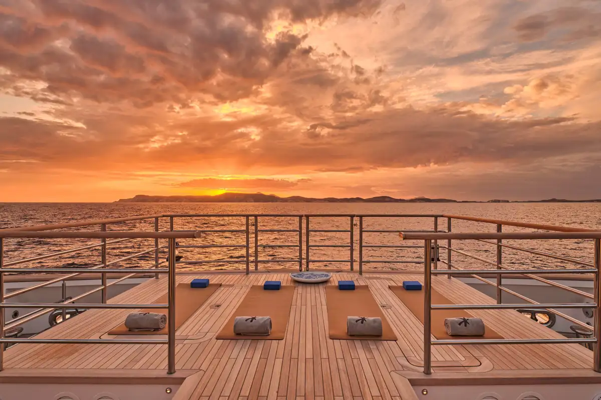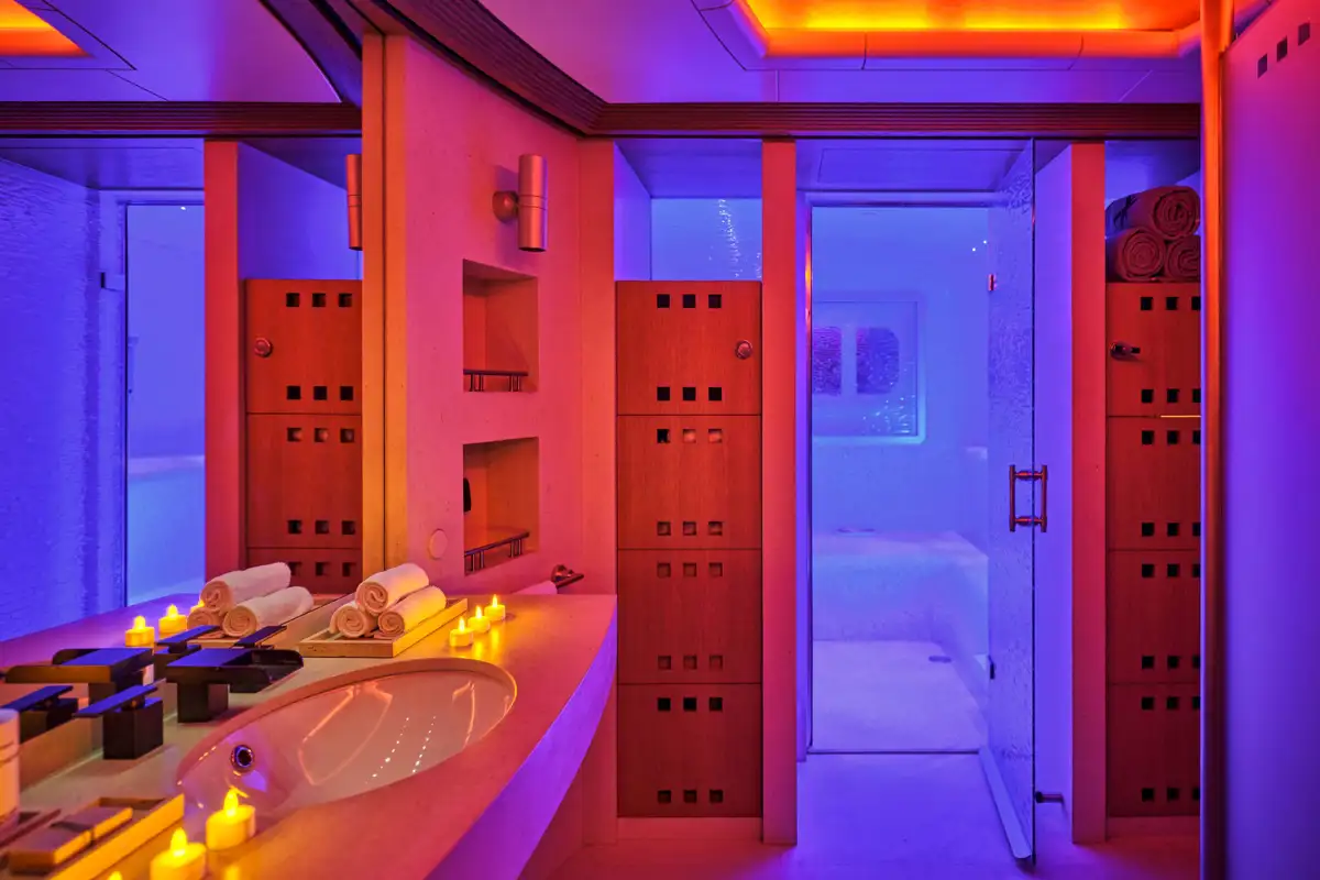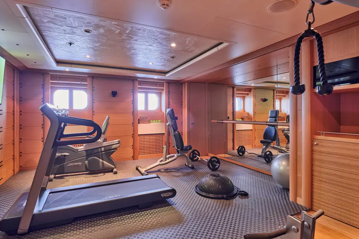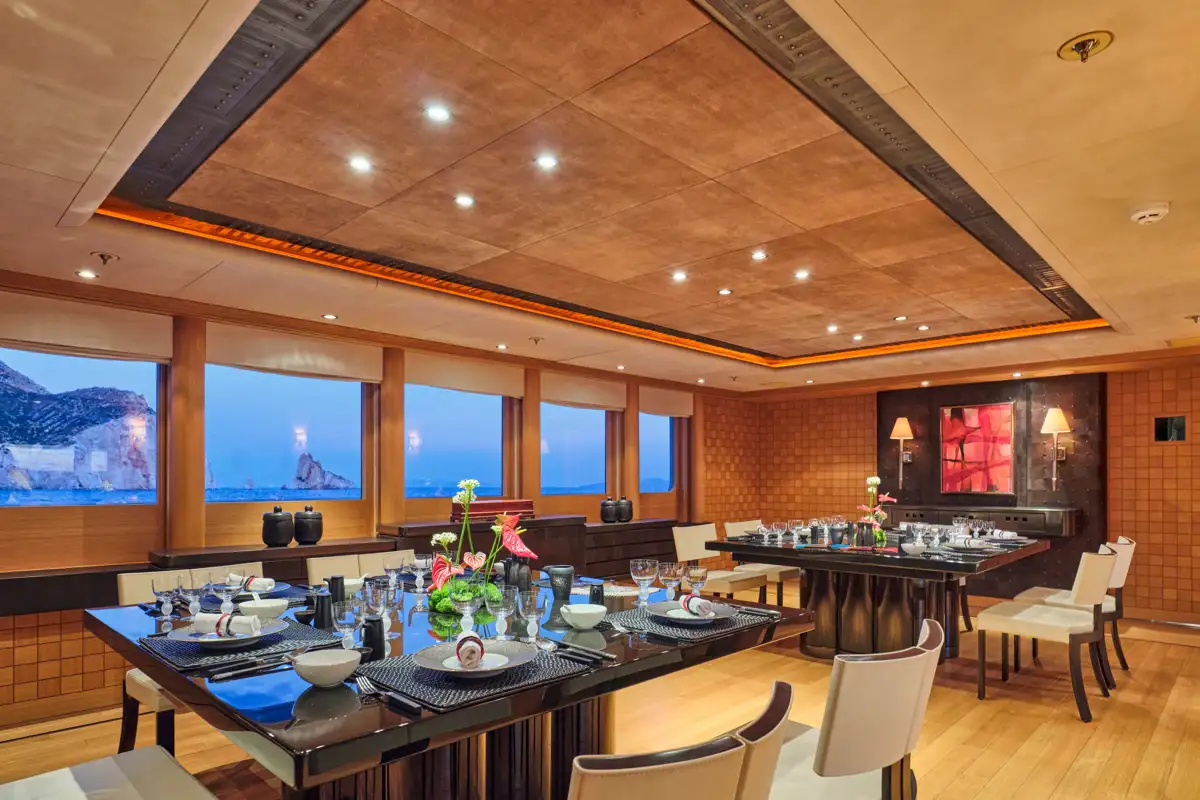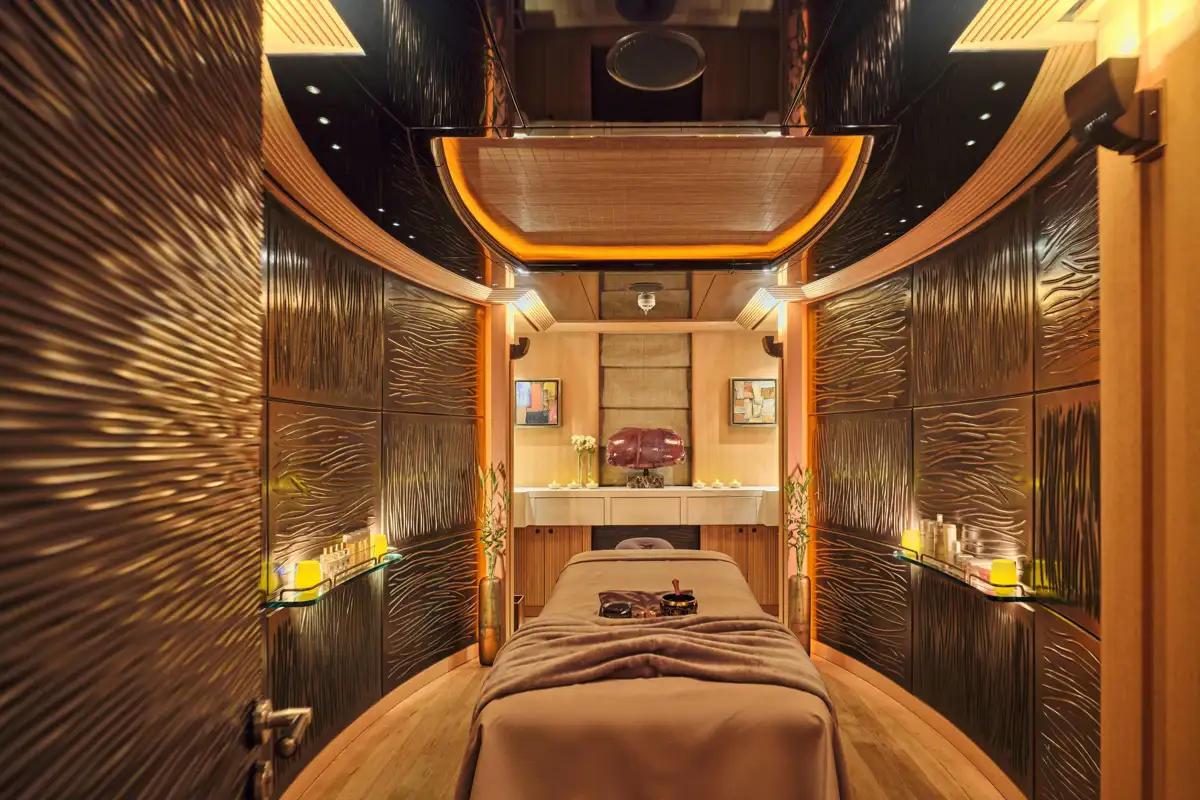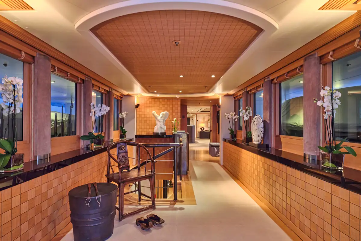 Disdale describes KOGO’s interiors as ‘clean modern lines with a Zen influence’ and there is a calming aura of balance on board as one descends to the lower deck, where guests can work out in a well-equipped gym, sweat it out in a steam room, freshen up in a shower room before enjoying a soothing rub down in the massage room.