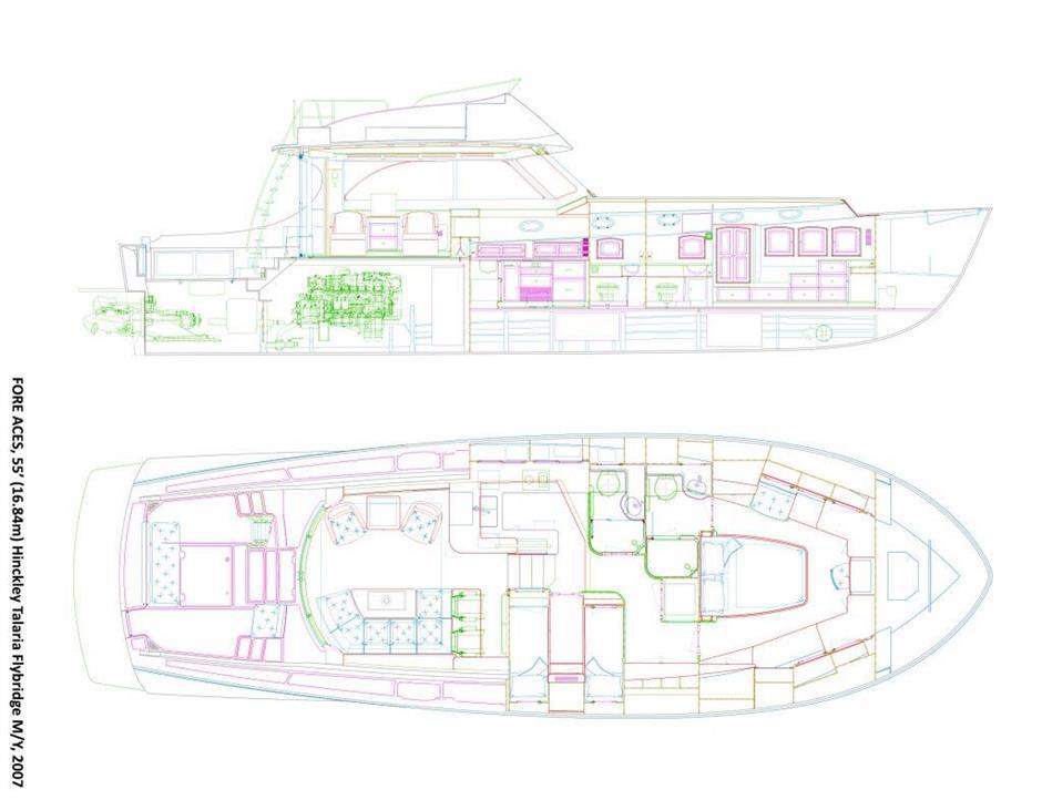 THREE ACES, a flybridge model, is one of six built and features a custom hardtop with four Bowmar skylight hatches. She is currently with her third owner since new and has been continually maintained and upgraded. With a recent Flag Blue hull paint job by Hinckley in 2021 through spring of 2023, she has undergone a major refit and overhauls of her primary machinery.