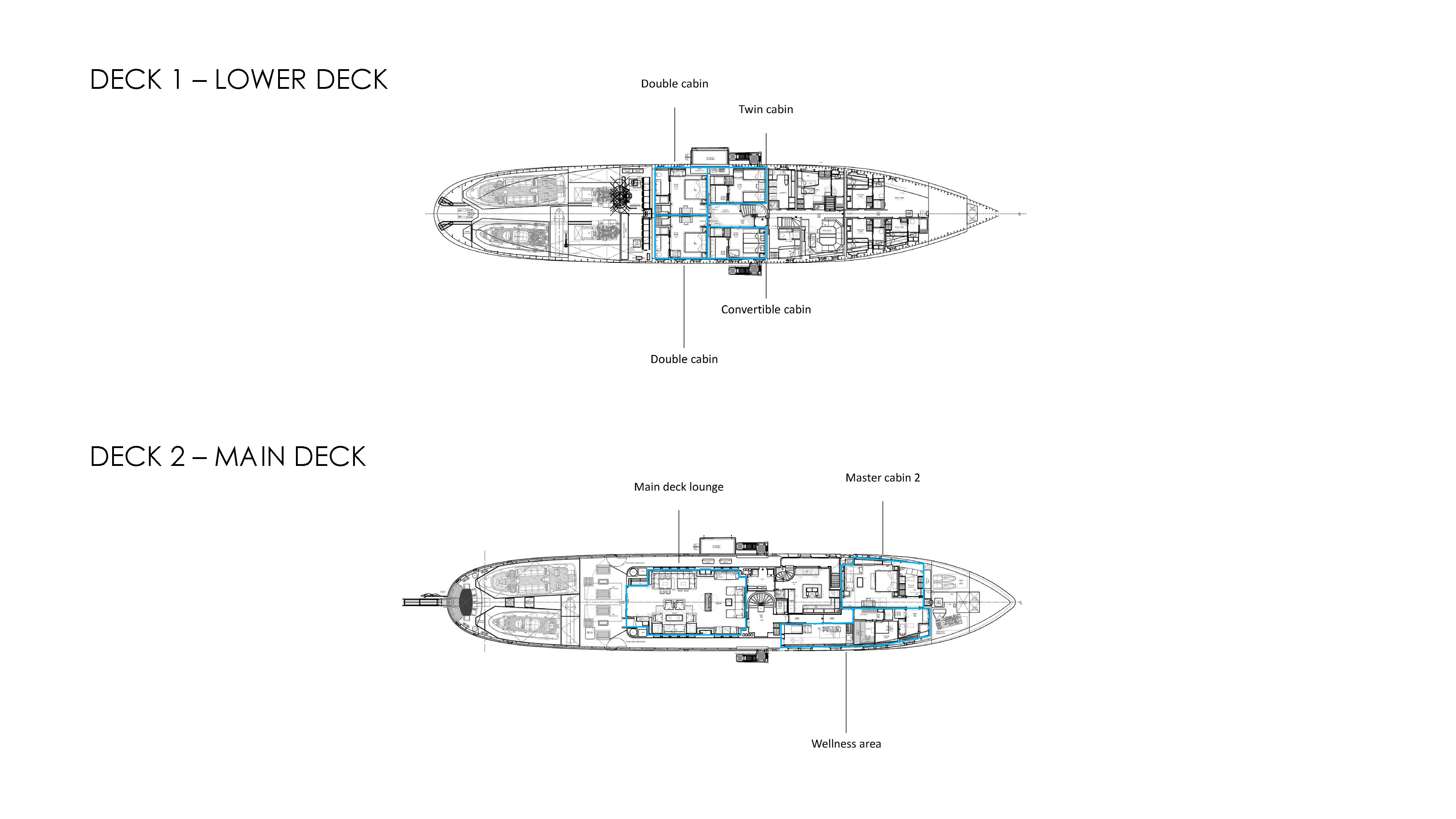 You awake in one of two master suites, one on the upper deck with 180 degree views forward and the other on the main deck. Head for the upper deck aft for a delicious breakfast before settling in the sun lounge aft to discuss the day's plans with the captain. If the morning heat is too intense, start the day in the air conditioned main saloon at the formal dining table and make plans in the lounge opposite.