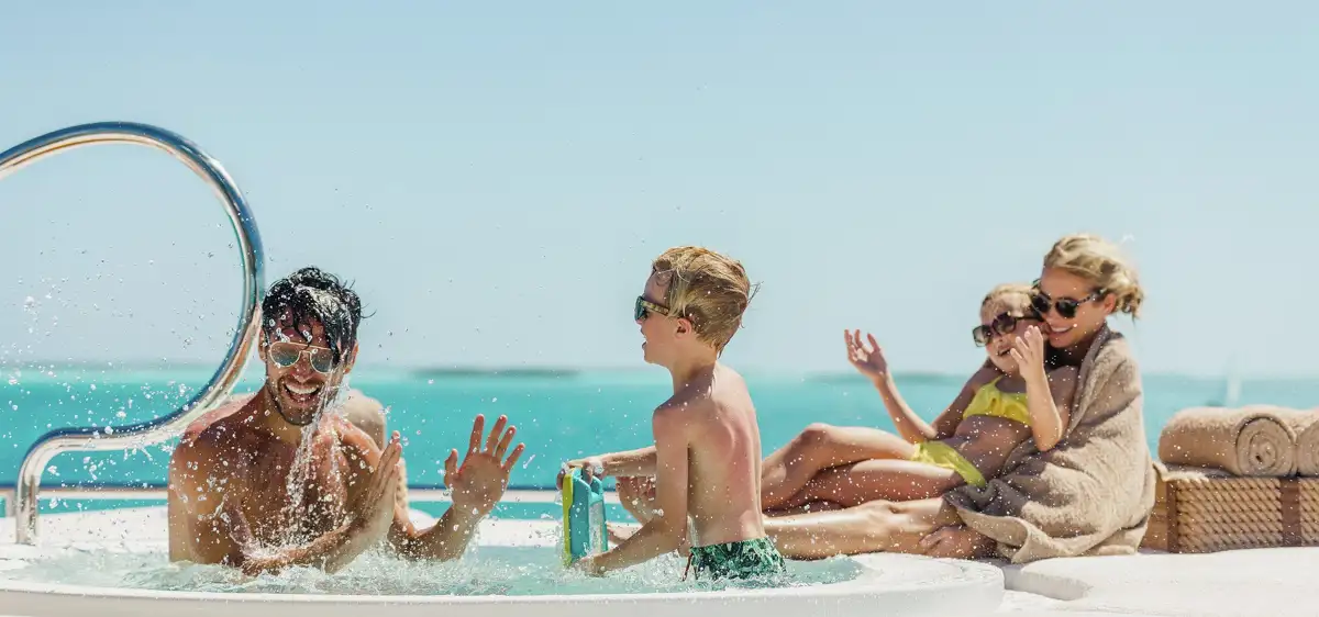 With three, even four generations on board charter, choose family-friendly features like hydraulic swim platforms, elevators, shaded deck jacuzzis and zero speed stabilisers for comfort at anchor.