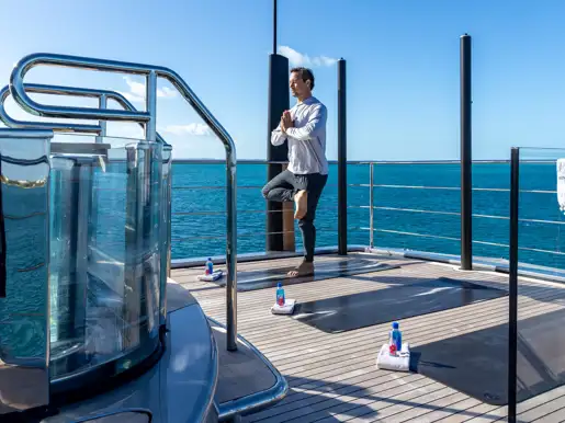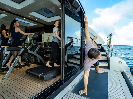 For workouts on the water head down to the air-conditioned beach club gym complete with skylight. After dark the tranquil sky lounge doubles as a cinema; the sofa seating is the perfect place to watch a movie with family and friends. The exterior spaces of ENTERPRISE are sleek, sexy and contemporary. The yacht’s exceptionally charter-friendly layout provides three teak decks with abundant lounging areas. The versatile sun deck is a stylish and modern space with a bar, al fresco lounge area, and a stunning glass jacuzzi for a true ‘on the water’ illusion. For privacy in port or to feel the wind in your hair underway, the foredeck seating is just the place to relax.