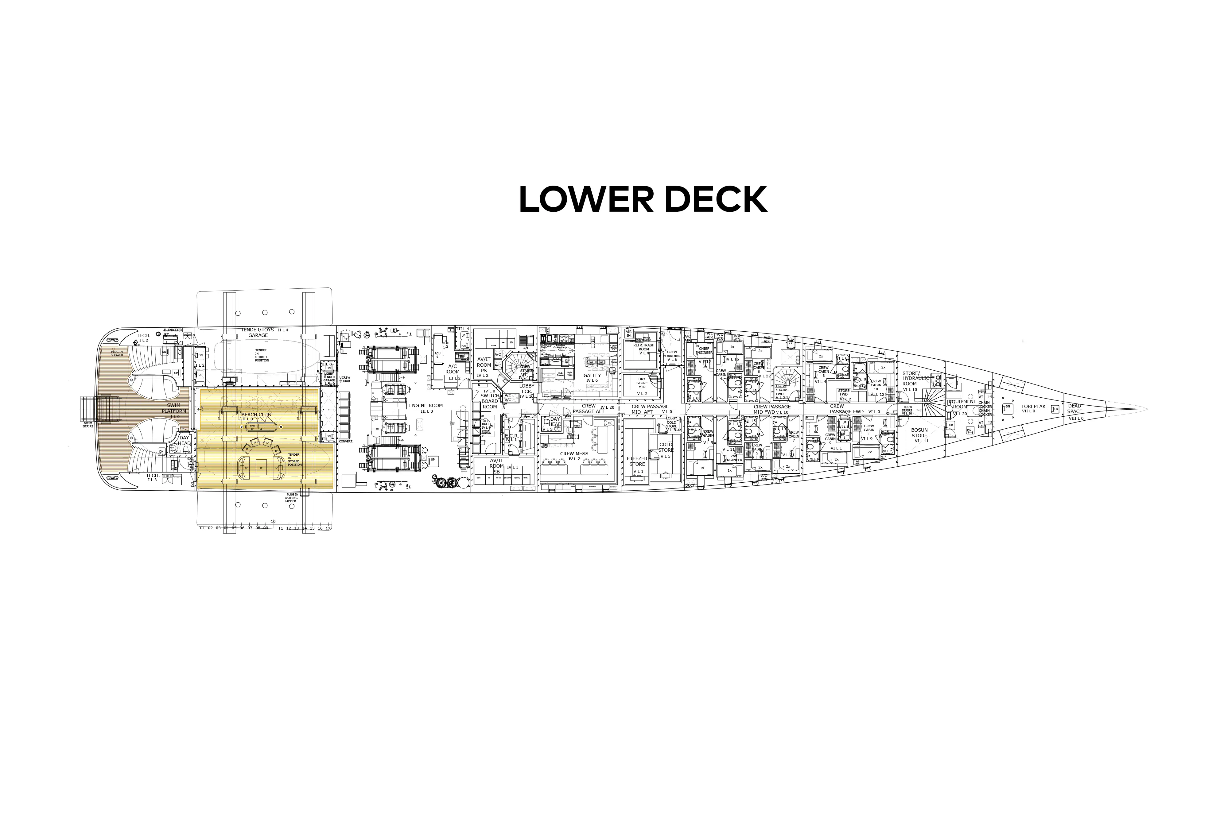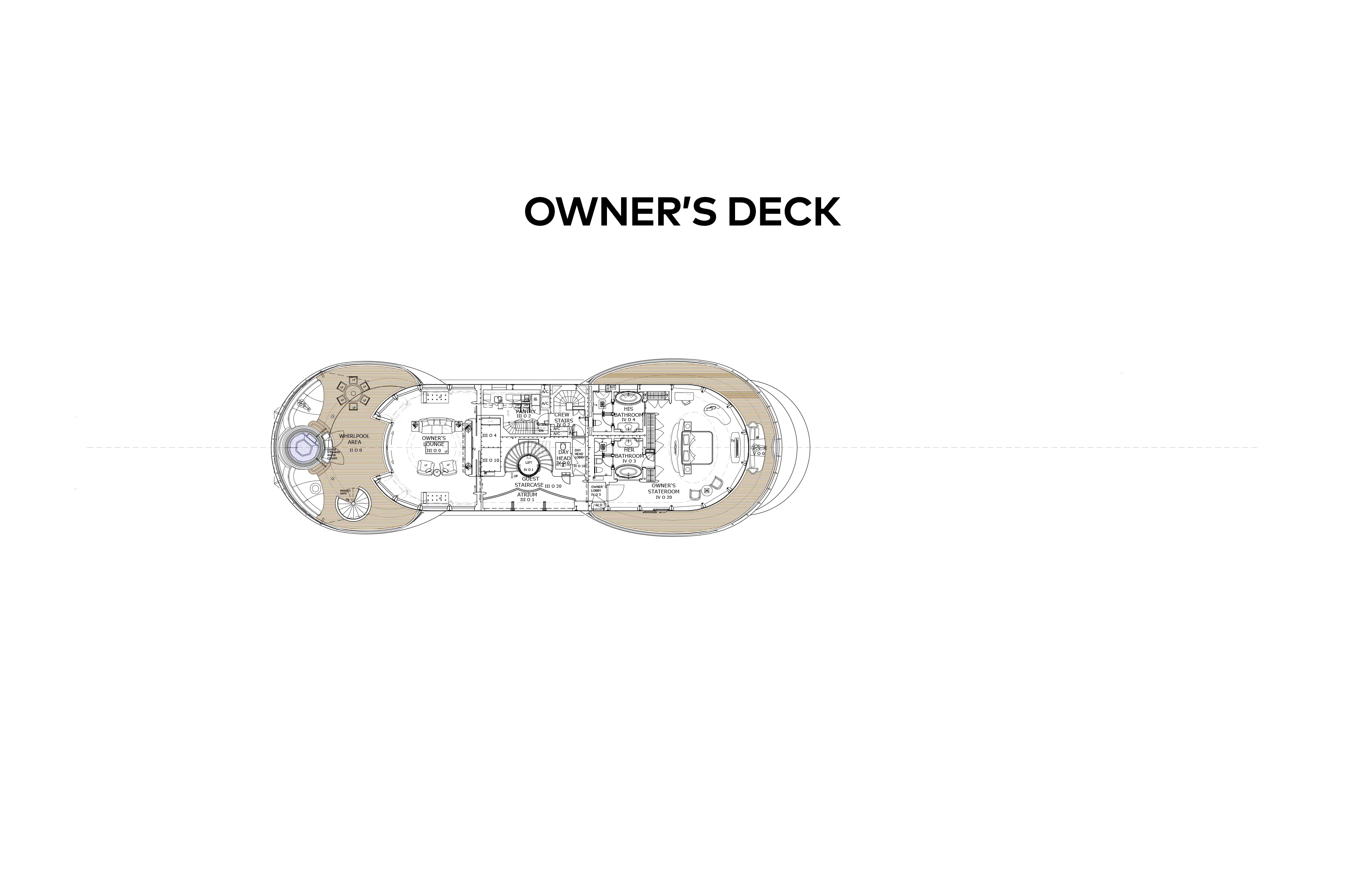 The entire upper deck is dedicated to the owner and includes a master suite and lounge, a private deck with jacuzzi and sun lounging area aft and a terrace area forward. Above the owner’s deck is the substantial sun deck with a lounge area and jacuzzi. There is also a large pool on the main deck with a swim-up bar. The main deck is also home to the guest accommodation with six double cabins, a lounge and dining area, a dedicated cinema room, spa, sauna and a gym. From here steps lead down to the large beach club with terrace area, and wide comfortable bathing steps to provide easy access to the plethora of water toys stored in the garage, which has also been fitted out with a bar and seating area to entertain guests while they enjoy the wide variety of water activities available.