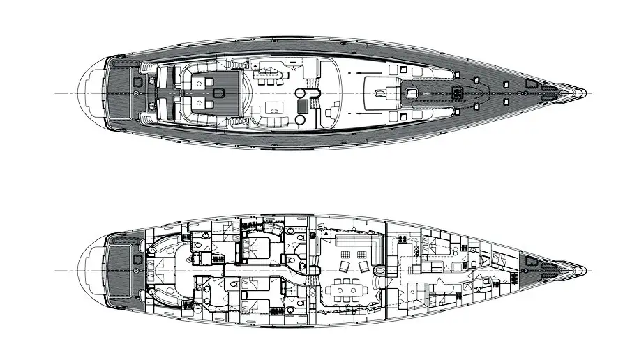 Head to the lower deck to change for dinner. The full beam master suite has ample storage, as well as a spacious en suite bathroom for a sailing yacht of this length. A VIP queen suite, double cabin with fixed upper single berth, and twin cabin complete the accommodation arrangement.