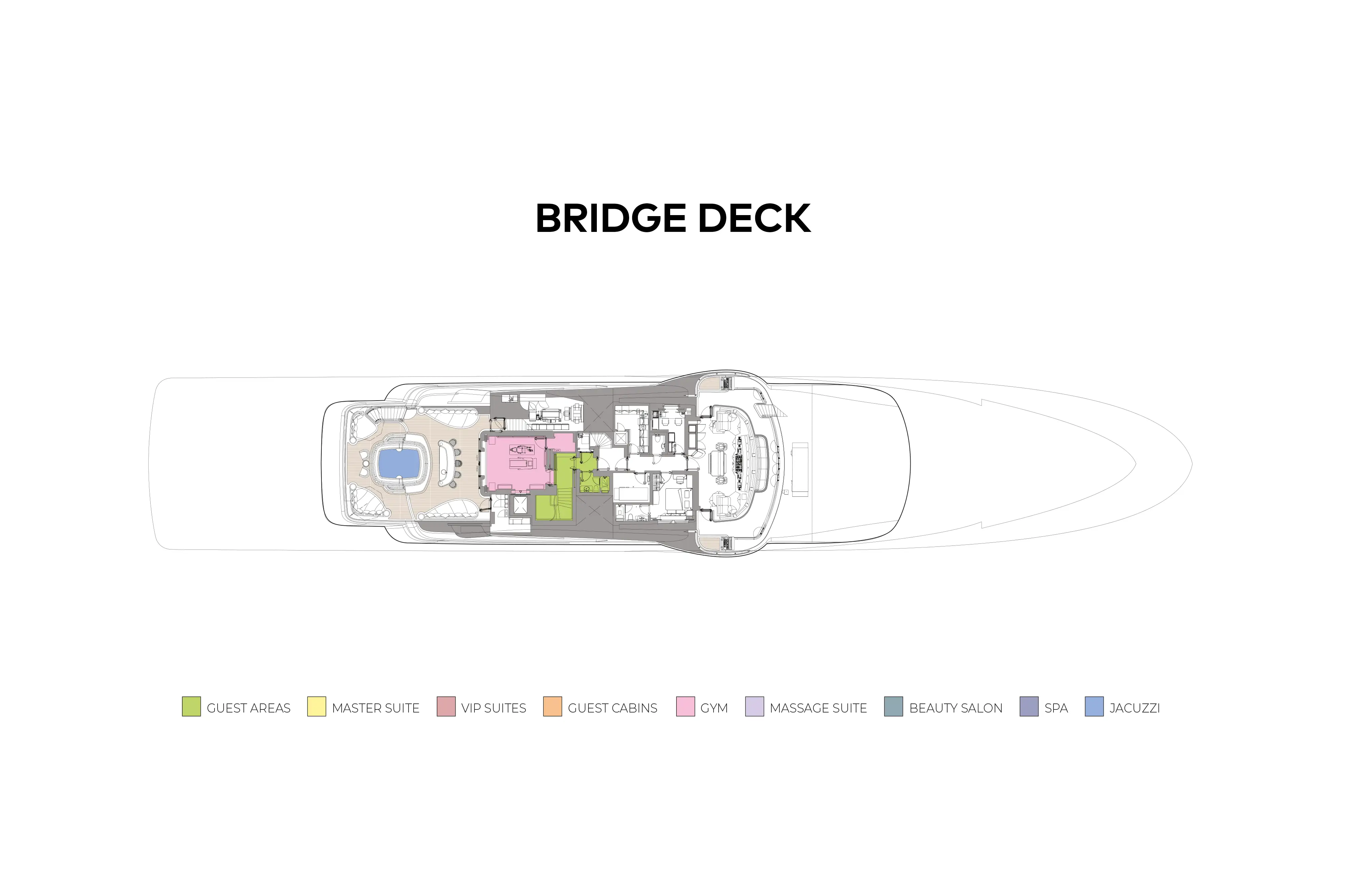 - Gorgeous bridge deck aft with convivial oversized jacuzzi; ample deck spaces & lovely sun deck lounging