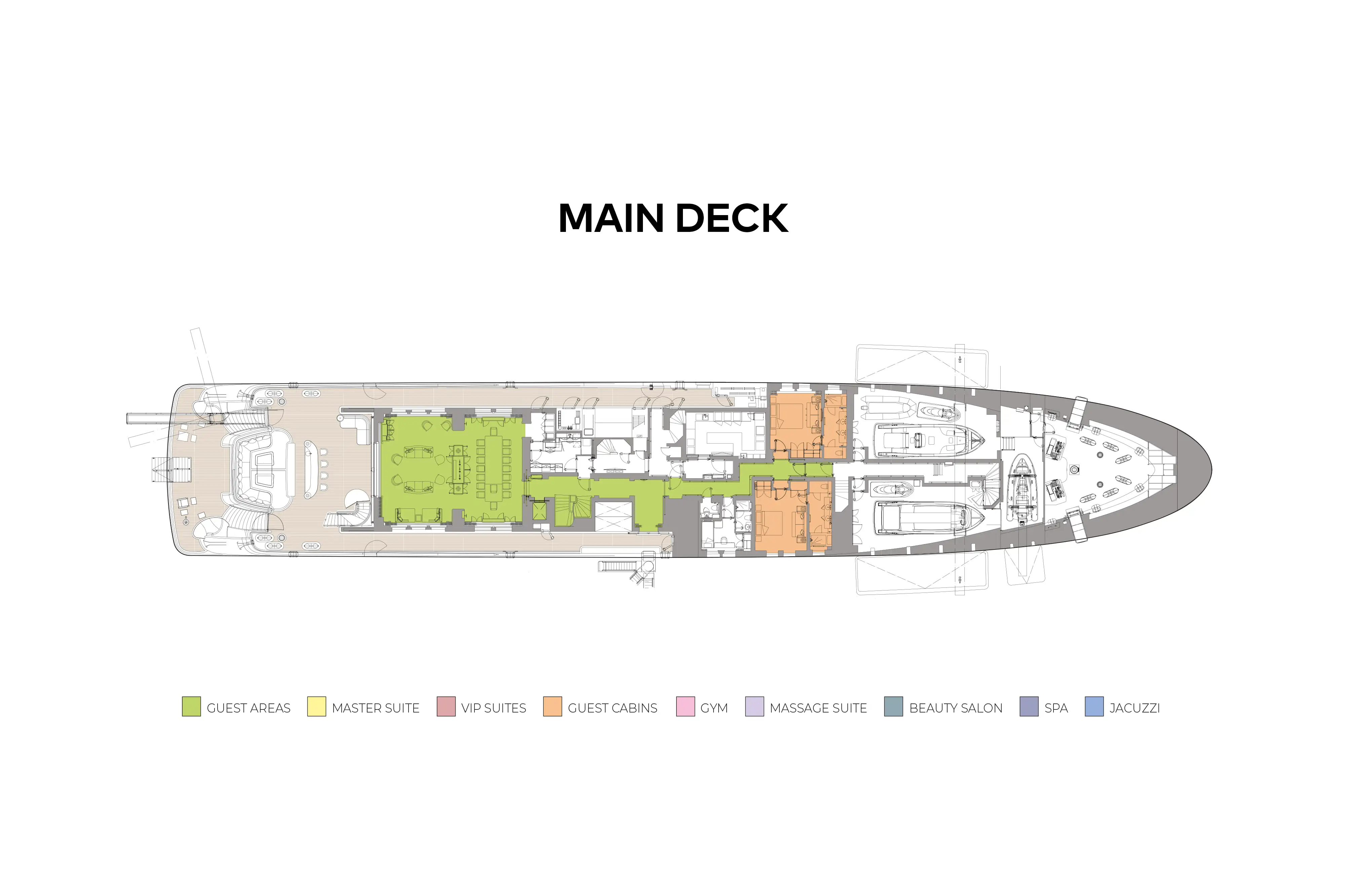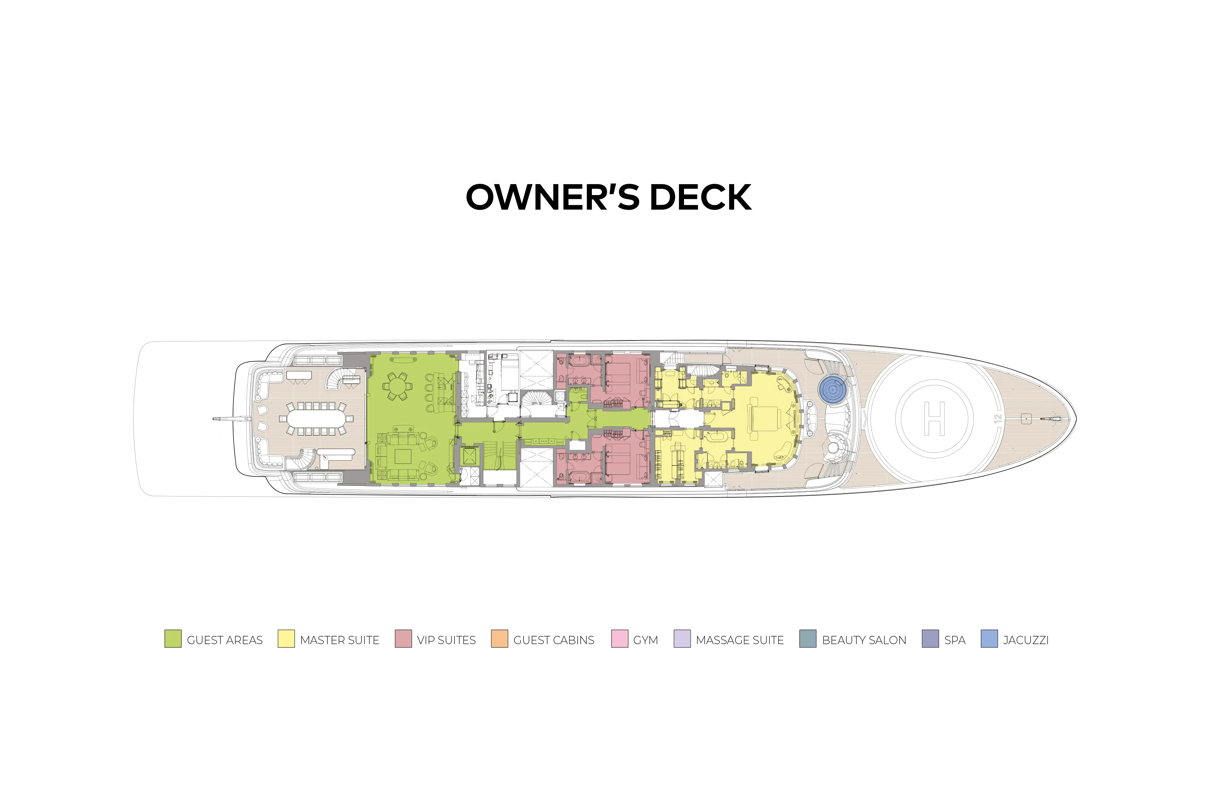 Careful consideration has also been given to privacy, with an entire deck, with lounge, dining, terrace and private jacuzzi, that can be reserved for the owner’s sole use. The owner’s suite offers panoramic views forward, as well as a study, his and hers bathrooms, walk in wardrobe, dressing room and its own private terrace.