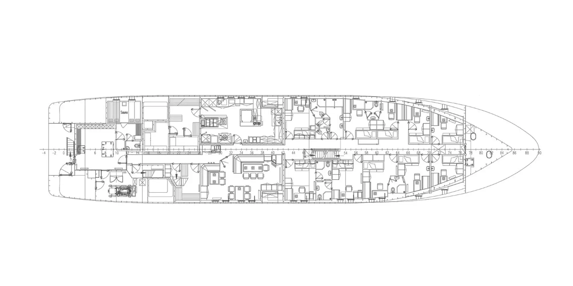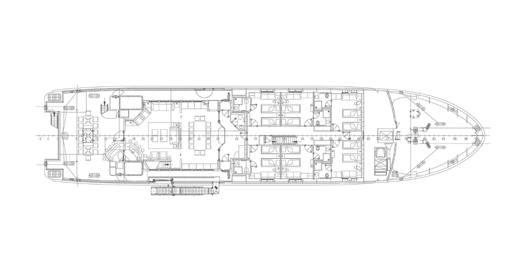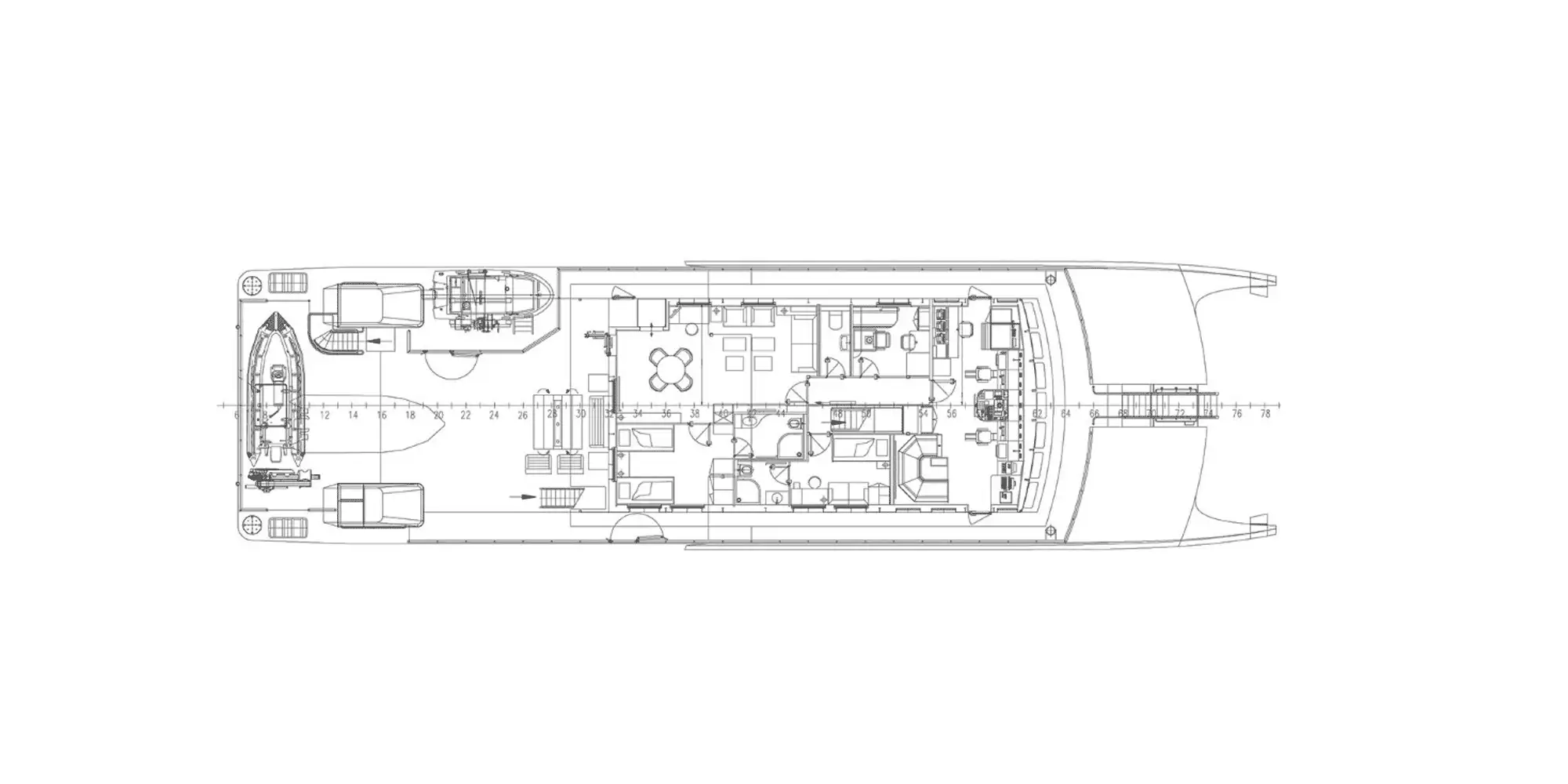 The interior offers light, functional and relaxed furnishings that feature beautiful woodwork and an intelligent layout for maximising space. The master cabin is situated on the upper deck, consisting of a double en suite and a large adjoining private lounge or study. The remaining six guest cabins on the main deck are practically identical, apart from subtle differences in colour scheme. A total of 12 guests are accommodated.
