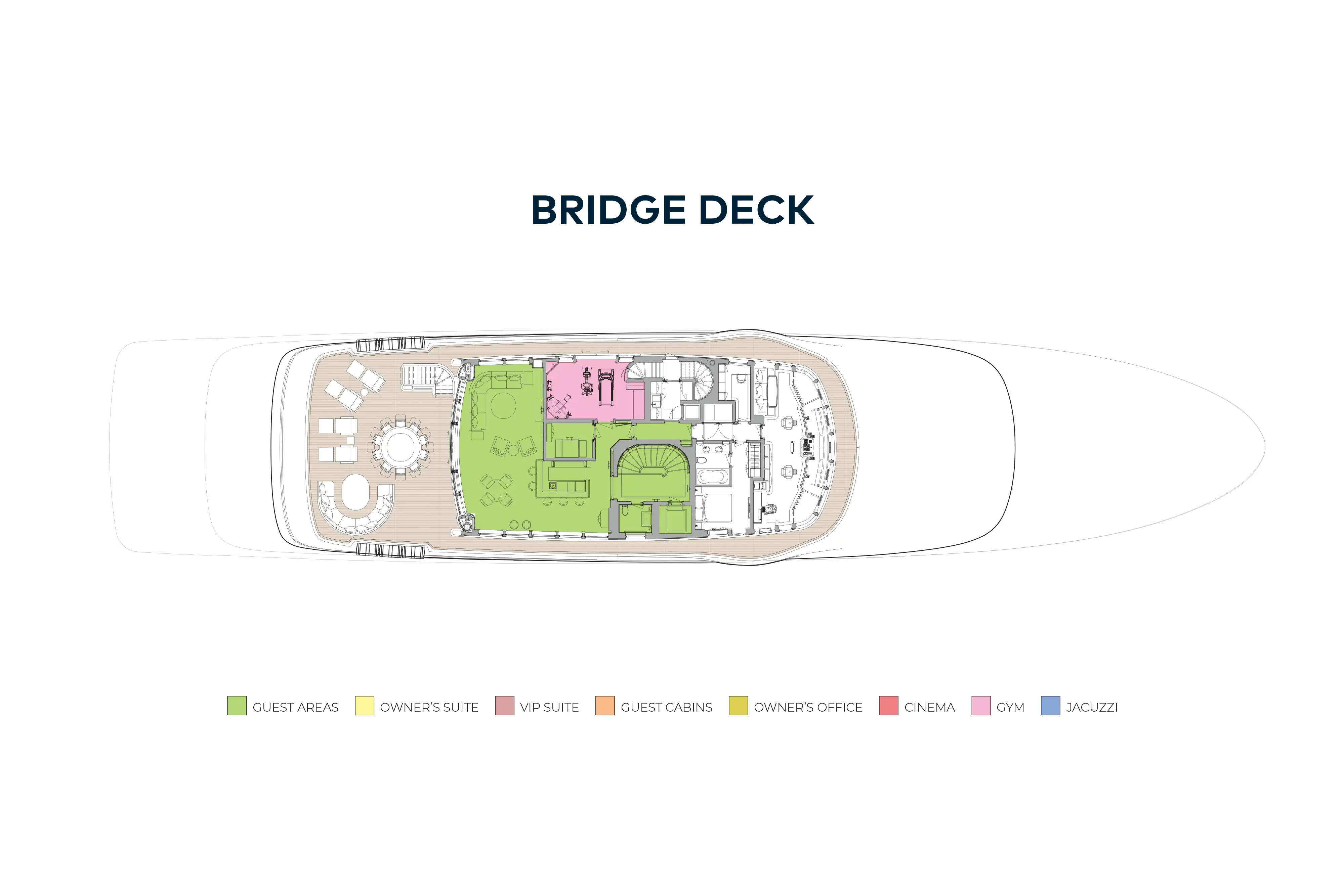 Expansive deck spaces host a variety of exotic dining options, from breakfast on the sun deck, to lunch by the dip pool and a five-star gourmet dinner for 22 guests at the impressive owner's deck dining table. Charter guests can make the most of the sun deck with its barbecue, jacuzzi and extensive sun loungers offering pure, uninterrupted relaxation.
