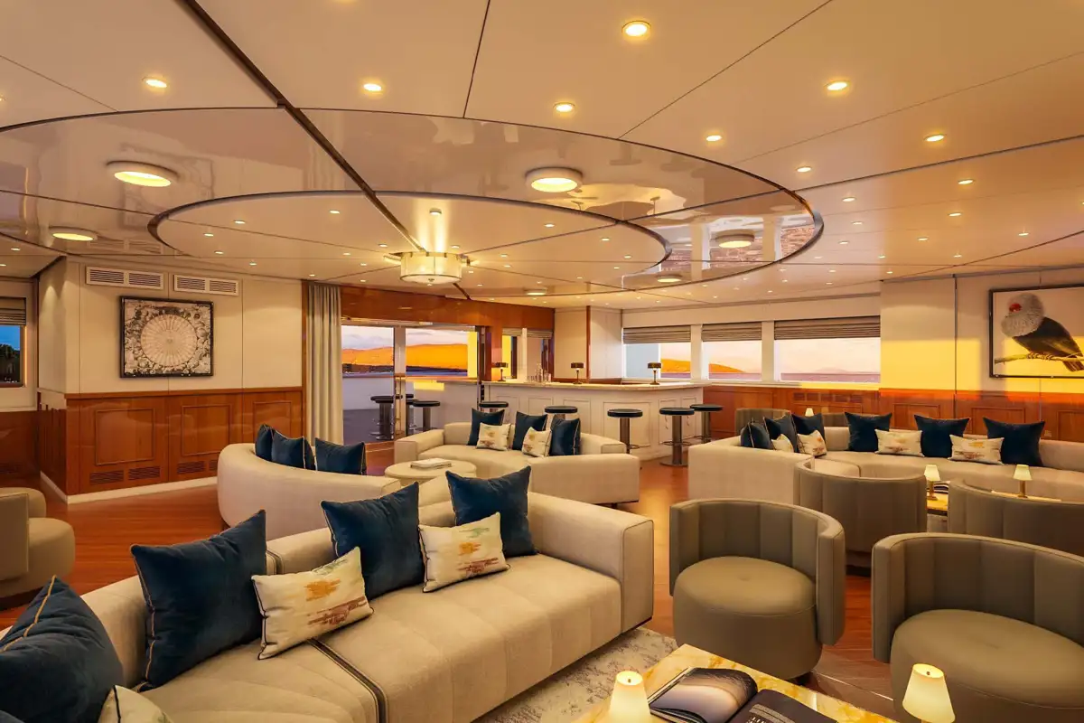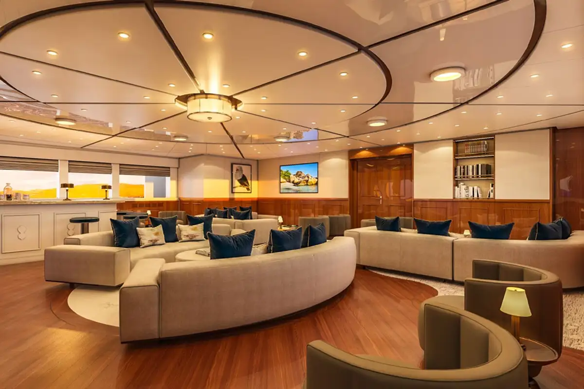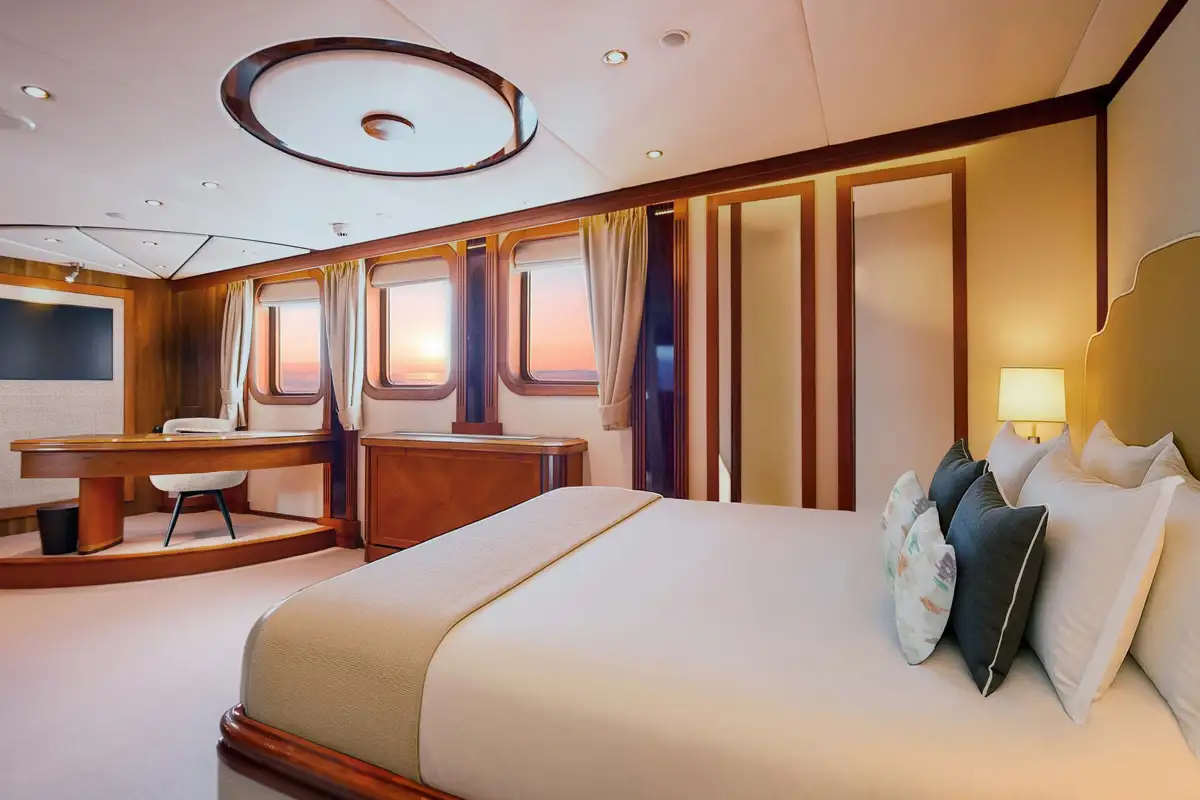 With a private master deck with suite, two VIP suites, five double cabins and five convertible cabins, she is ready to give up to 22 guests the natural experience of a lifetime at the ends of the earth. She also gives them every possible comfort and amenity with dining tables and bars inside and out and plenty of deck space for sun lounging or exercise.