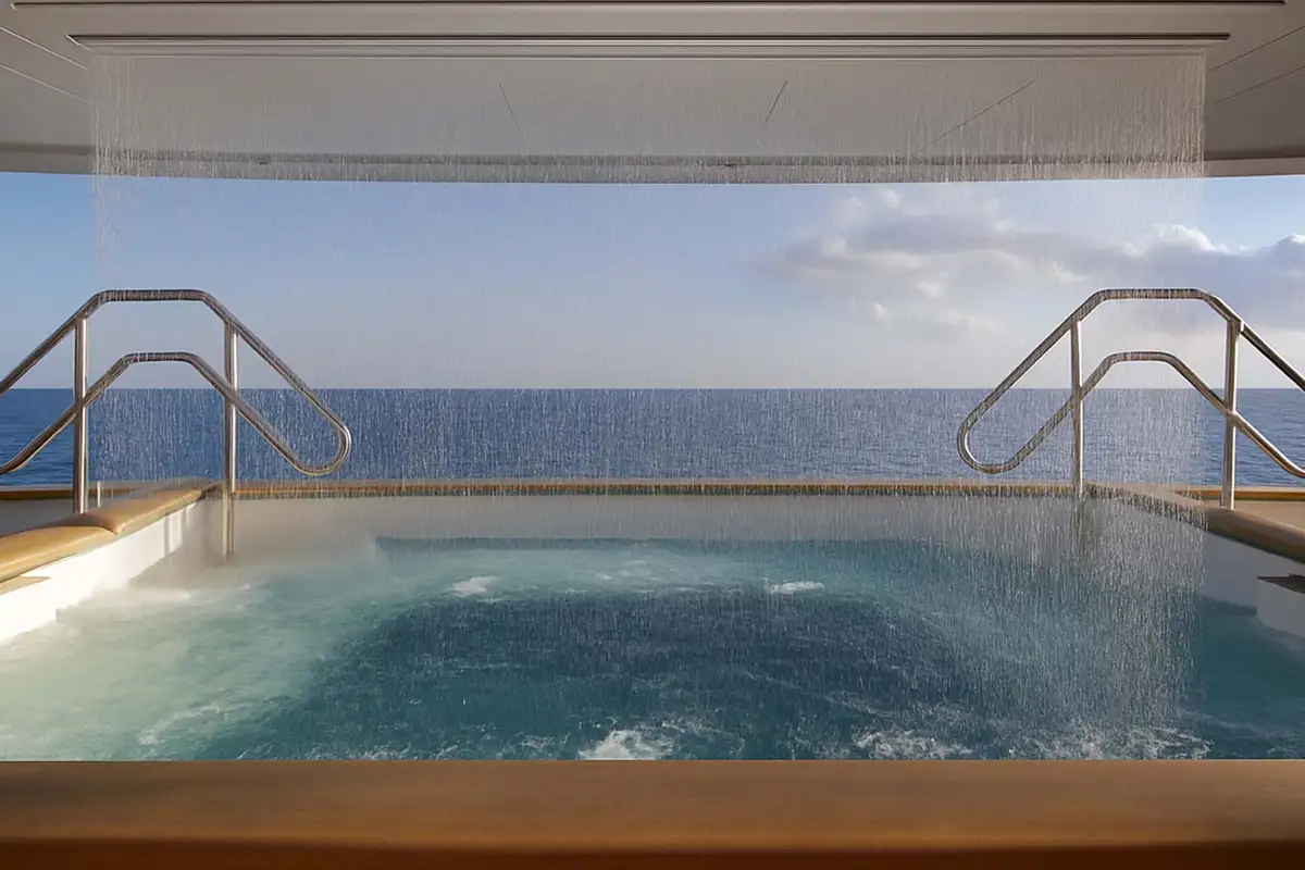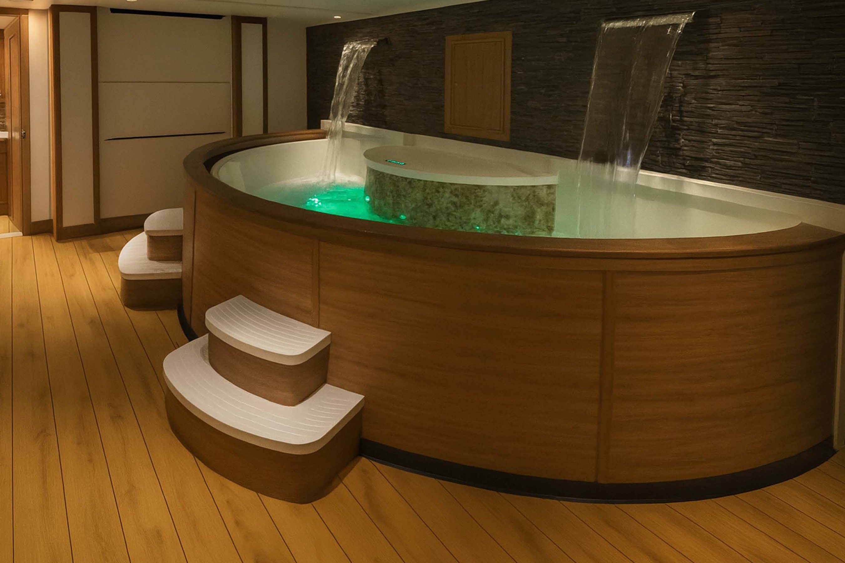 - 16-person jacuzzi on the main deck & 8-person jacuzzi in the spa