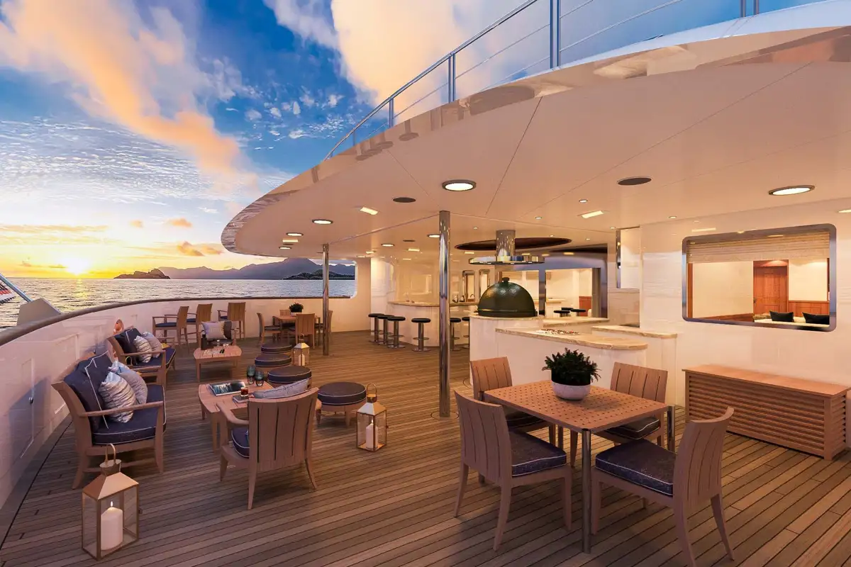 When you're back on board, downtime never felt so good. You can slip into the 16-person pool with waterfall feature on the main deck aft or get some me-time in the Balinese spa with sauna, jacuzzi and beauty salon. You can work out in the gym or catch a movie in the 14-person cinema. You can enjoy fresh produce cooked on the BBQ by one of two chefs and enjoy cocktails at indoor and outdoor bars.