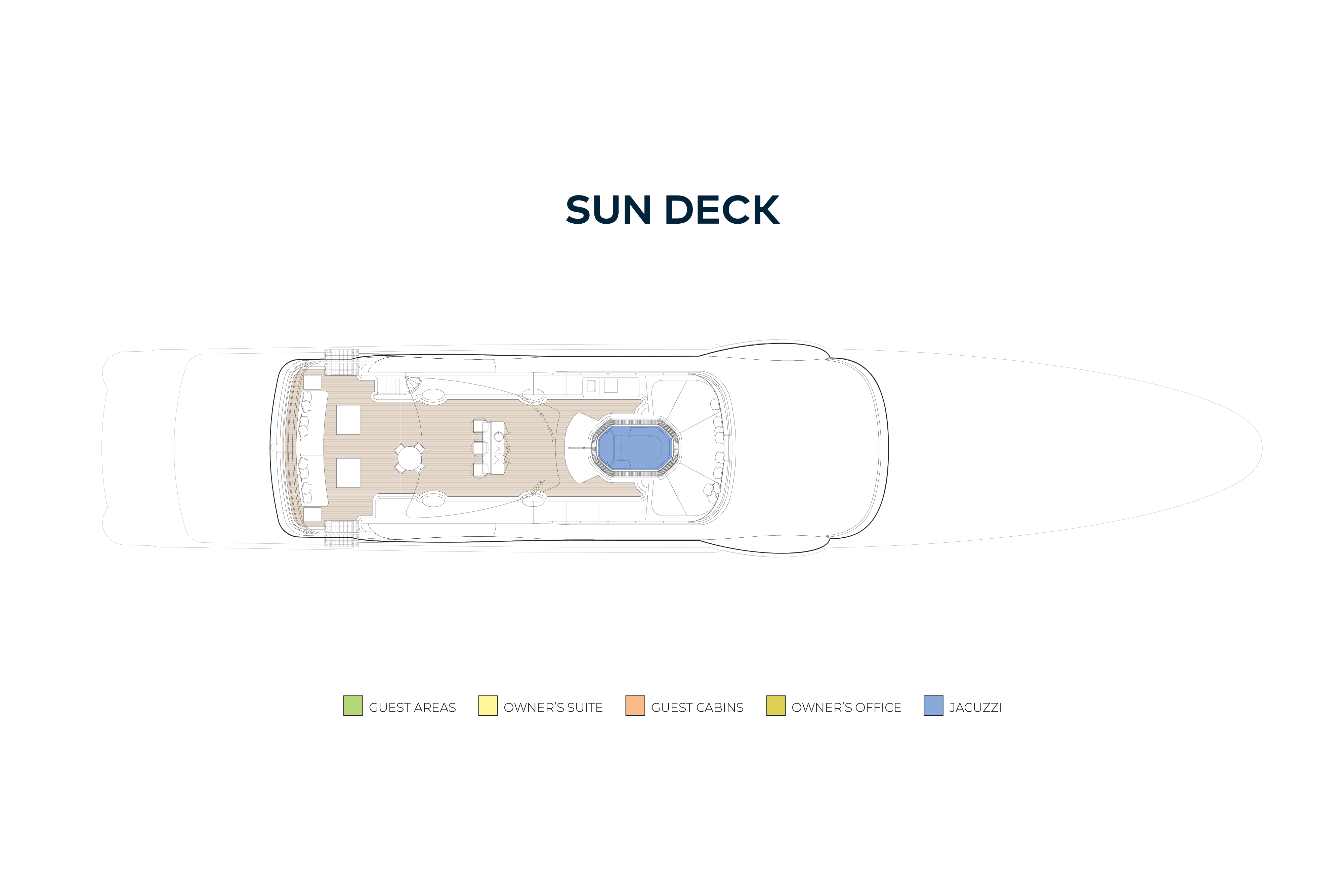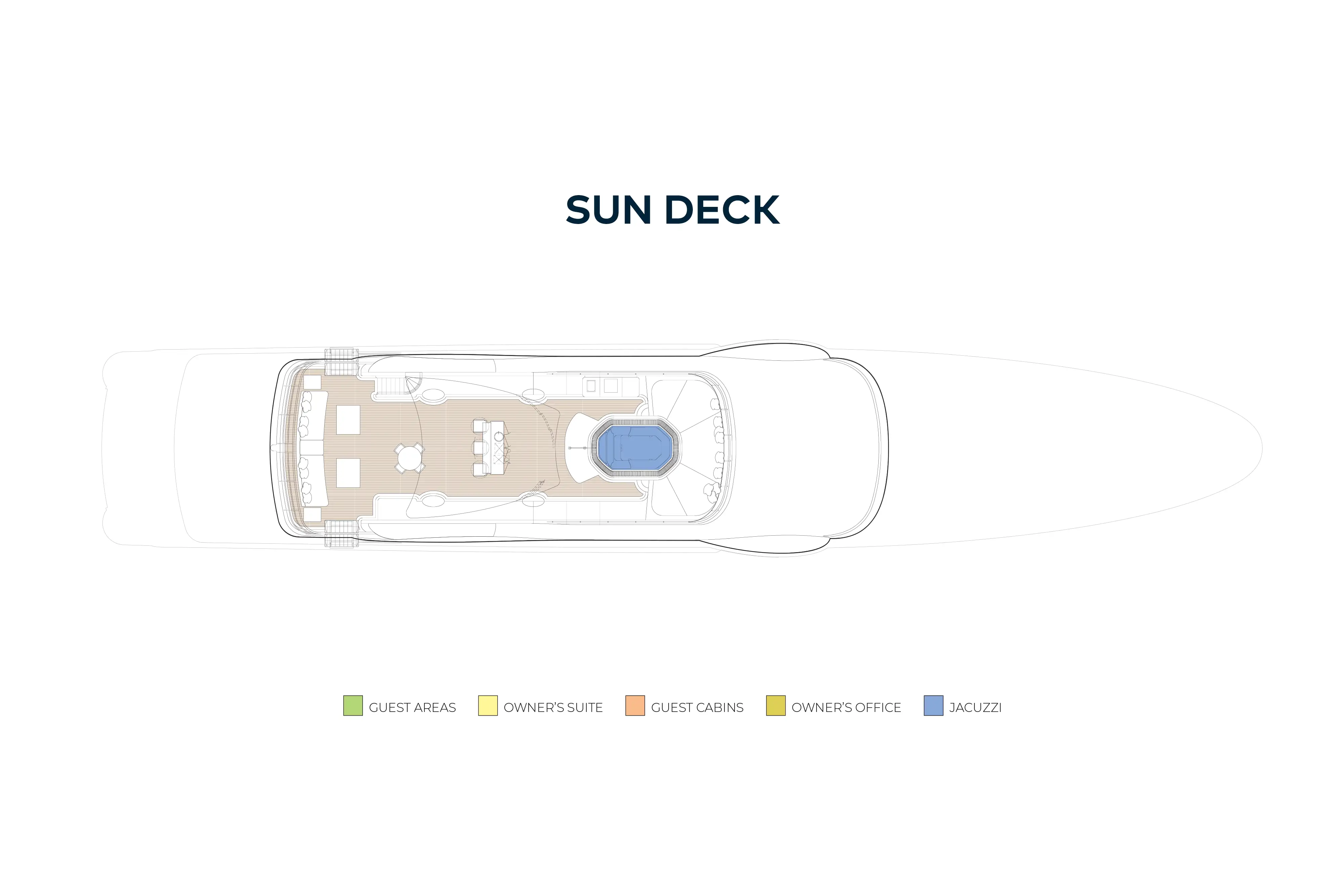 Her guests love the sun deck, where you can soak in the sun in the large jacuzzi, stretch out on the sunpads to work on your tan, work out on the exercise equipment, enjoy a sundowner at the fully equipped bar or just relax with a good book on the aft deck loungers. After dark it's back to the sun deck to watch movies under the stars.