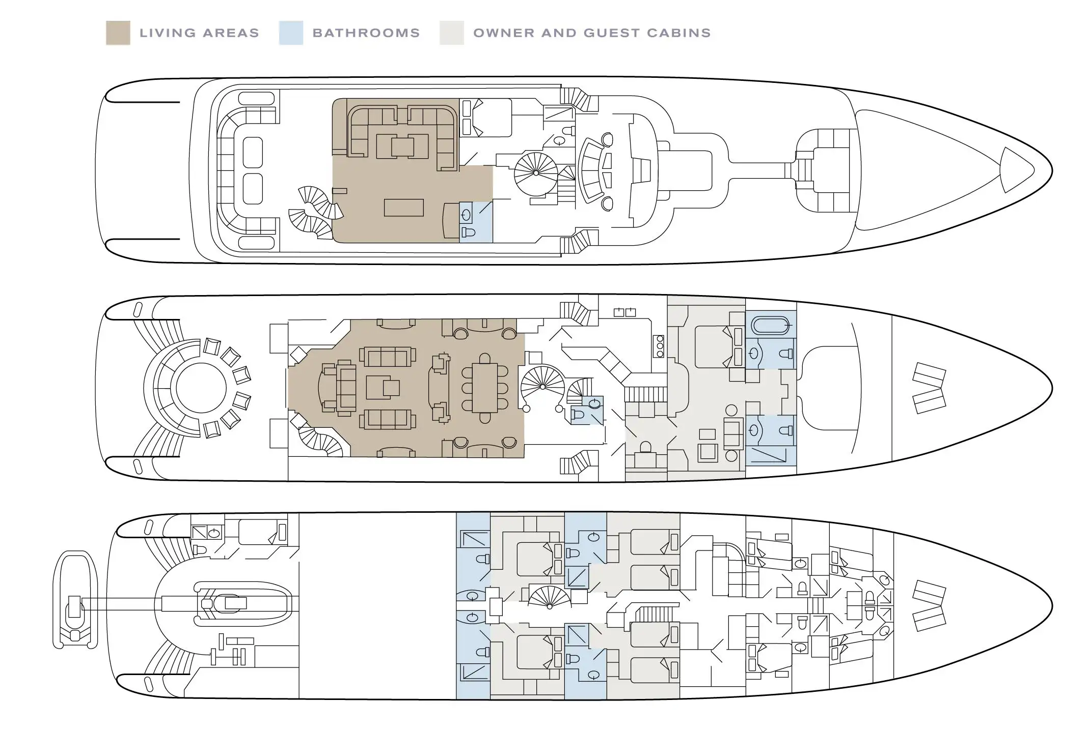 The supremely spacious full beam master suite incorporates its own saloon, study, dressing room and his and her bathrooms, with gently curved shapes and warm tones creating a peaceful ambience. The rest of the guest accommodation is made up of two double and two twin cabins on the lower deck which provide a welcoming retreat at the end of the day.