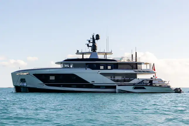 SKYLER comfortably accommodates 10 guests in five tastefully appointed cabins. The spacious full beam master suite is located on the main deck and features unique terraces on both port and starboard side that slide out at the touch of a button. The his and hers master en suite includes a central shower and separate bathtub. Additionally, four stylish guest cabins are located on the lower deck.