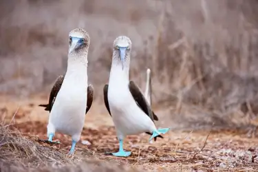 These birds have an elaborate courtship ritual. The male gives the female a small stick or stone, then tips his beak, tail, and wing tips skyward, whistles, and goose-steps around the female showing off his feet.