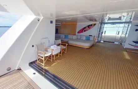 The new beach club is open to the aft for your watersports and there is a new lounge, bar and 77in screen. At night it transforms into a nightclub