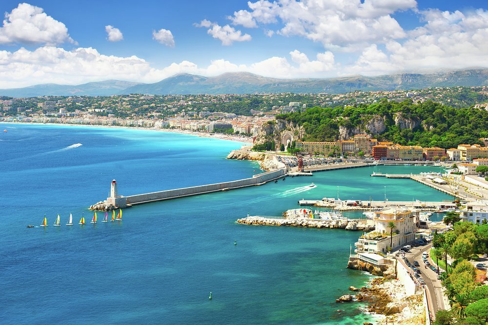 While berthed in the Port of Nice, take a stroll to the town’s small beaches Bains Militaires, Coco Beach, and in between Plage de la Réserve, just visible bottom right in this photo.