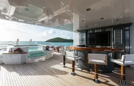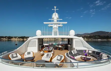 ‘The top deck is dedicated to sun lovers and al fresco living,’ says Baynes. ‘There’s the glass-fronted jacuzzi, then under the hardtop is a full-sized sit-up bar for eight people. Plus, further forward, there’s a large dining table and an outdoor lounge. It’s no surprise that this yacht won design awards when she launched in 2013 - and she has been carefully maintained since by her current owner, with a complete repaint in her most recent refurb.’
