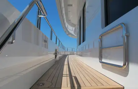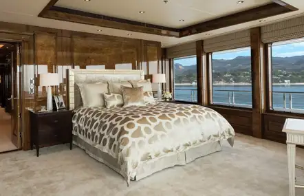 ‘The owner's deck is really special,’ continues Baynes. ‘The master suite faces forwards, looking through full-length windows on three side. As it’s on the upper deck, you get these amazing panoramic views. The glass doors open onto a private forward deck - that’s where I’d have breakfast every morning if I owned this yacht. The suite also has an office for when you need to take time out to work as well.’