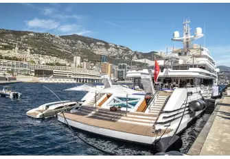 The main lounge bar is cool - it’s quite a cosy space with just three stools and the bottles in these big back-lit portholes on either side. When charterers want a bigger party space the sun deck is great fun – and there’s a slide from that top deck to the sea. The beach club is another great feature – it’s very generous for a yacht of this size, and made even bigger by a protected pool that extends from the swim platform.