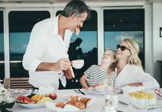 Back on board thoughts turn to dinner. Yesterday you chose the formality of the main deck dining room for a special occasion. Tonight, after toasting the sunset with your favourite sundowner in the foredeck lounge, you'll dine on the main deck aft where, with folding balconies either side, you have limitless views or your beautiful surroundings and a real connection with the sea.