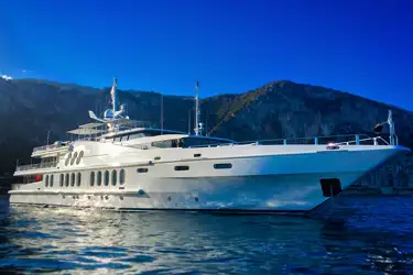 Her 10 guests will enjoy her five cabins, including a spacious upper deck master suite with a private adjoining room, observation lounge and his and her en suite, and she accommodates up to 12 crew. Twin 3,480hp MTU engines give her a top speed of 20kn with a cruising speed of 13kn.