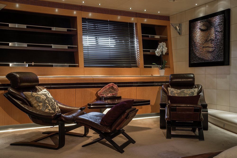 Today the yacht is as iconic as ever. 'She is in immaculate condition,' says Hannah. Her exterior styling and interior design, by the serial award-winning British designer Ken Freivokh, evoke the industrial Art-Deco aesthetic of Fritz Lang's Metropolis, a bold symphony of wood, leather, steel and glass. 'She's incredible,' Hannah continues. 'Around every corner there are stop-and-stare artworks and architectural features, like the three-deck sky-lit atrium where the stairs spiral around the main mast. She's as fresh and impressive as the day she was launched.