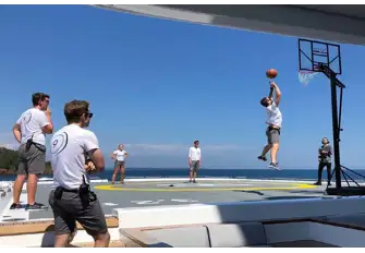 'If you prefer your exercise to be competitive, the helipad works brilliantly as a games deck for all sorts of ball sports. Of course it's first and foremost a helipad and there is a helicopter available too for an additional cost, which really expands your range to explore the attractions ashore. Below the helipad is a clever hangar so that huge deck space is always ready for sports, gym equipment or yoga.