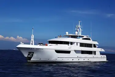 A beam of 8.9m (29.2ft) and a draft of 2.8m (9.2ft) give her an interior volume of 491GT. Outside spaces include a large sun deck with a sun lounge forward that doubles as an open-air dining space. Under the hardtop is a large sit-up bar and versatile deck space, aft is a raised jacuzzi surrounded by sunpads and space for sunloungers. There is also a dayhead.