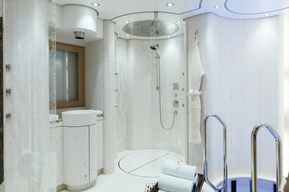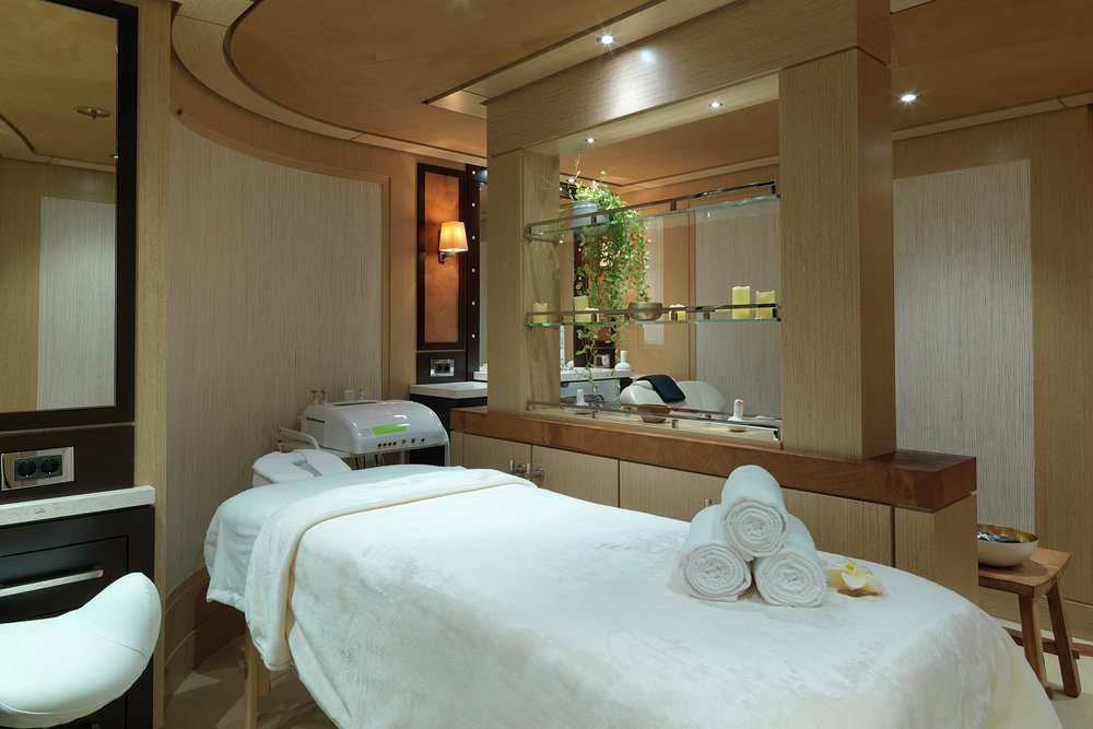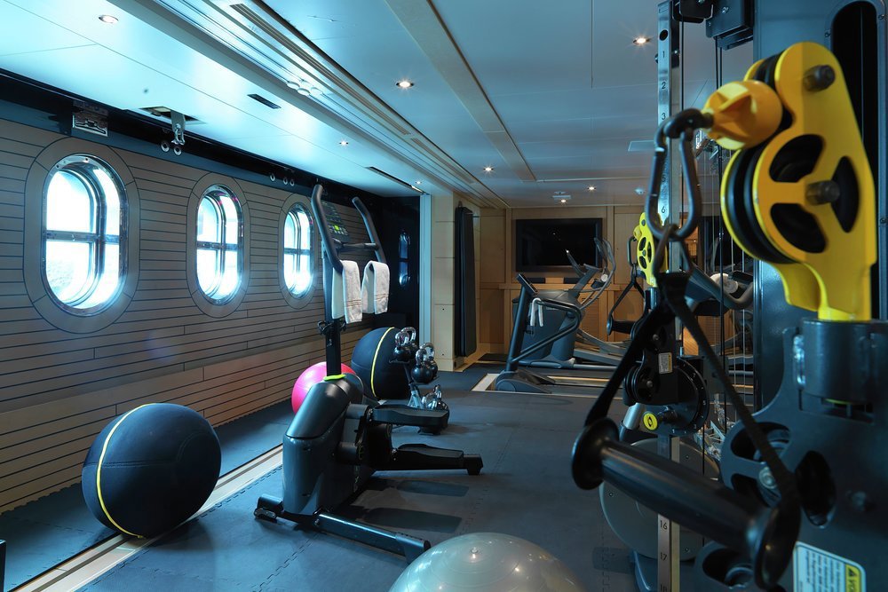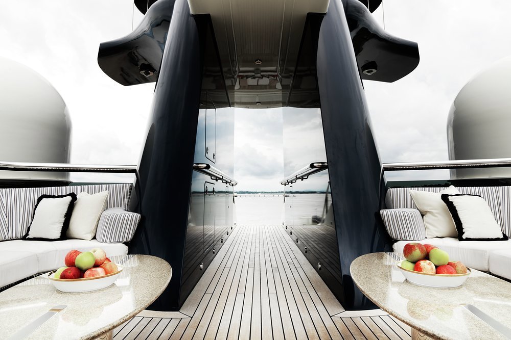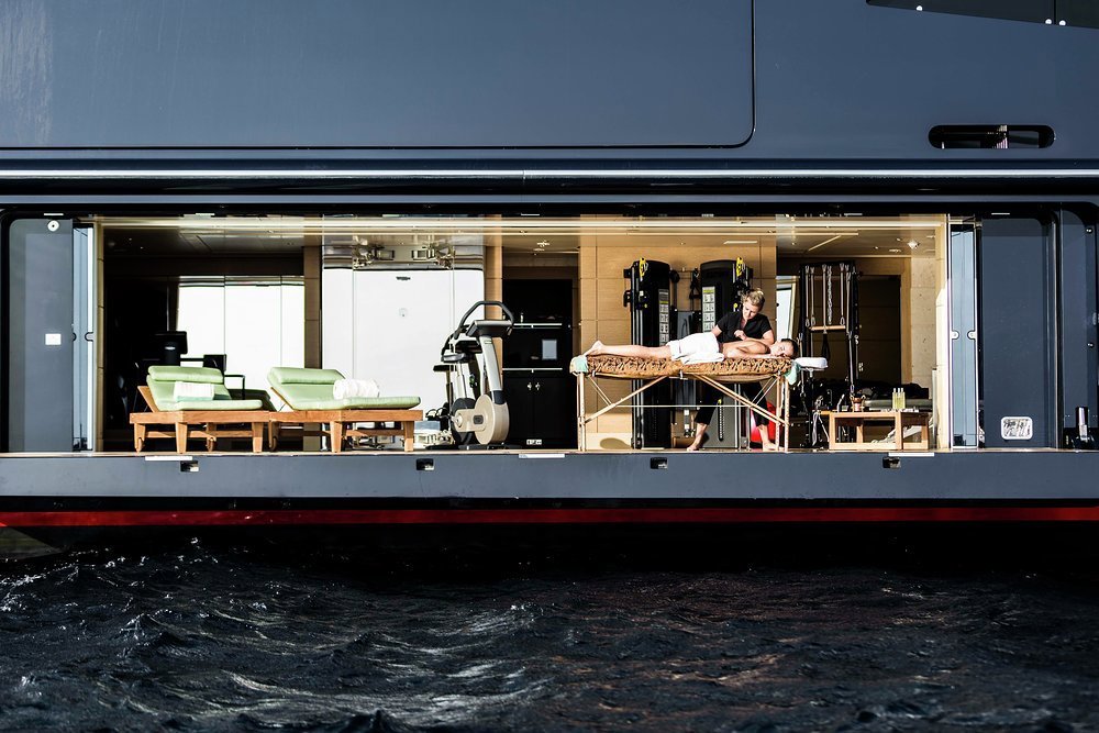 Guests can arrive at the sea terrace on the starboard side and take the tubular glass elevator from lower to main and upper decks. If they choose to arrive at the stern, they will find a large beach club with lounge seating and a bar. This relaxation area is linked directly to a dedicated gym on the starboard side with a vast shell door that opens to create a sea terrace, providing light and access to the water. On the port side is the spa area with steam room, sauna, massage and ice plunge pool. There is also a dive store and technical areas for all the watertoys.