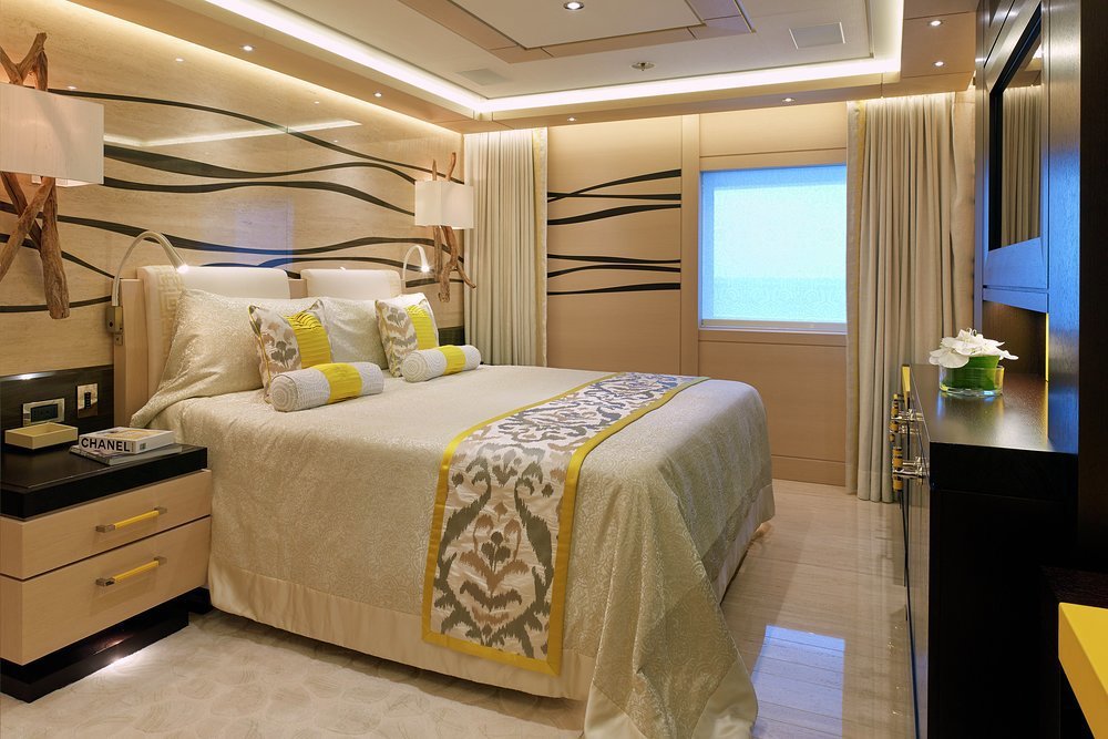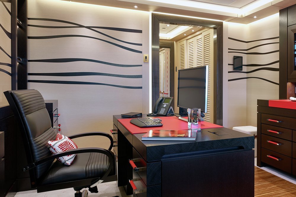 Accommodation is both extensive and flexible, she is tremendously adaptable and well suited to all sorts of uses. The forward-facing owner's suite on the upper deck has so much natural light from a feature skylight running the length of the cabin. There's a vast his and hers bathroom, walk in wardrobes, a private owner's office, adjacent staff cabin and a private terrace forward with its own jacuzzi and endless views across the foredeck. It's quite stunning work by Winch.