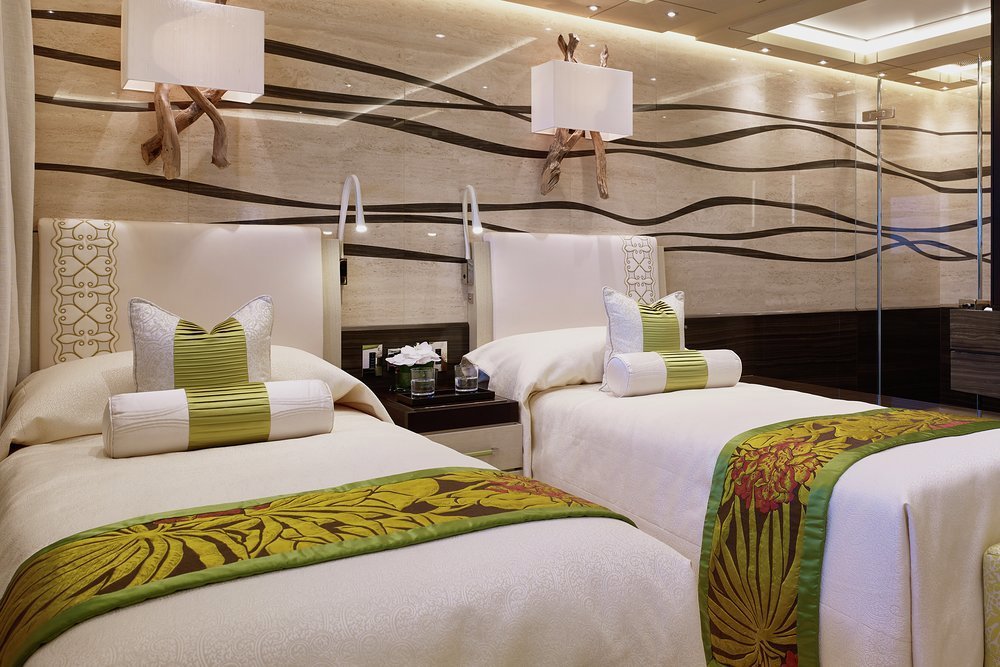 The VVIP suite is on the bridge deck above, facing aft onto a private terrace and on over the huge upper deck aft to the anchorage beyond, spectacular views. The remaining seven dedicated cabins are forward on the main deck, including two VIP suites with their own folding balconies, and two further rooms are convertible as guest cabins.