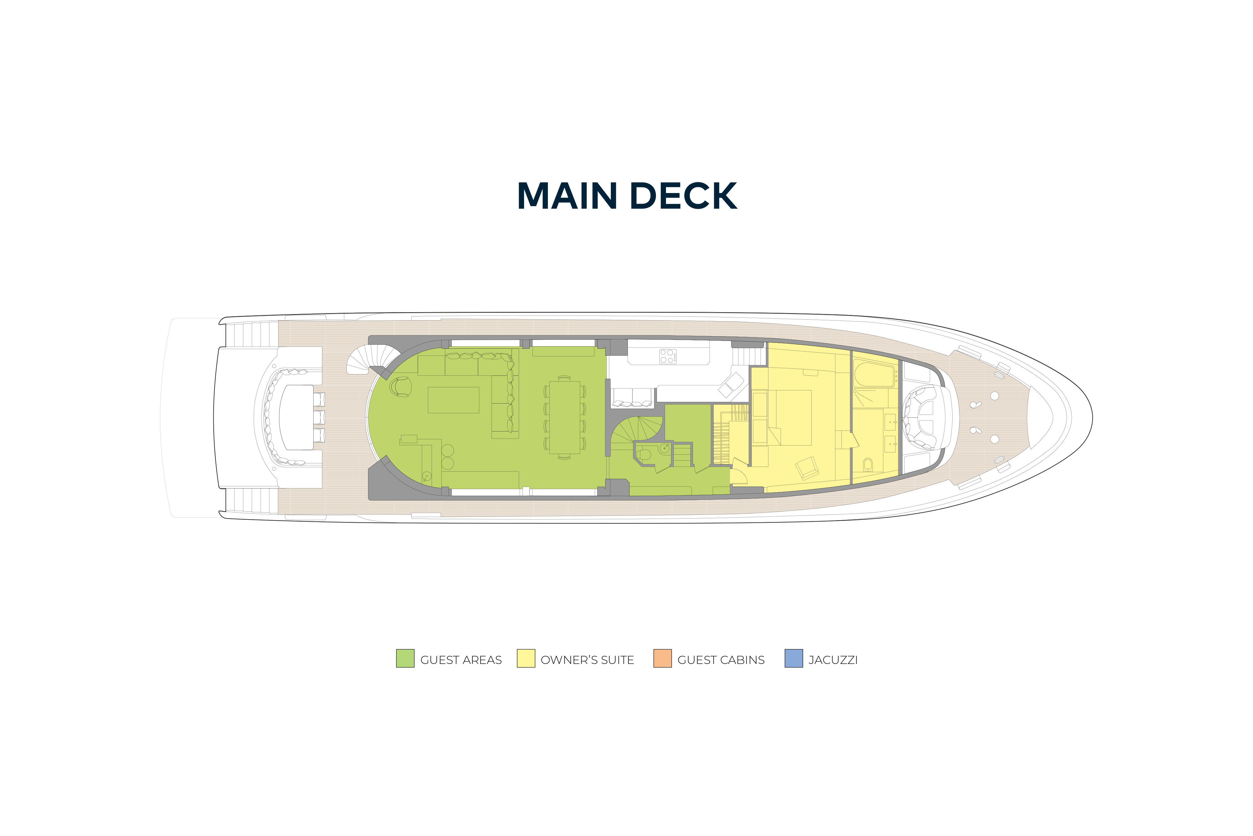 The main deck aft has open-air dining and a drop-down TV. Steps either side lead down to the large swim platform, which is used for toy stowage underway, and the tender garage, which also has internal access from the main deck aft. Walkaround sidedecks lead forward to a Portuguese bridge and large sunpad and full-height sliding glass doors open into the main saloon. Inside the main saloon, which has huge picture windows, is a fully equipped bar, making the main deck aft well suited to entertainment. There is an L-shaped lounge opposite a pop-up TV, a formal dining area forward and a dayhead off the main lobby.
