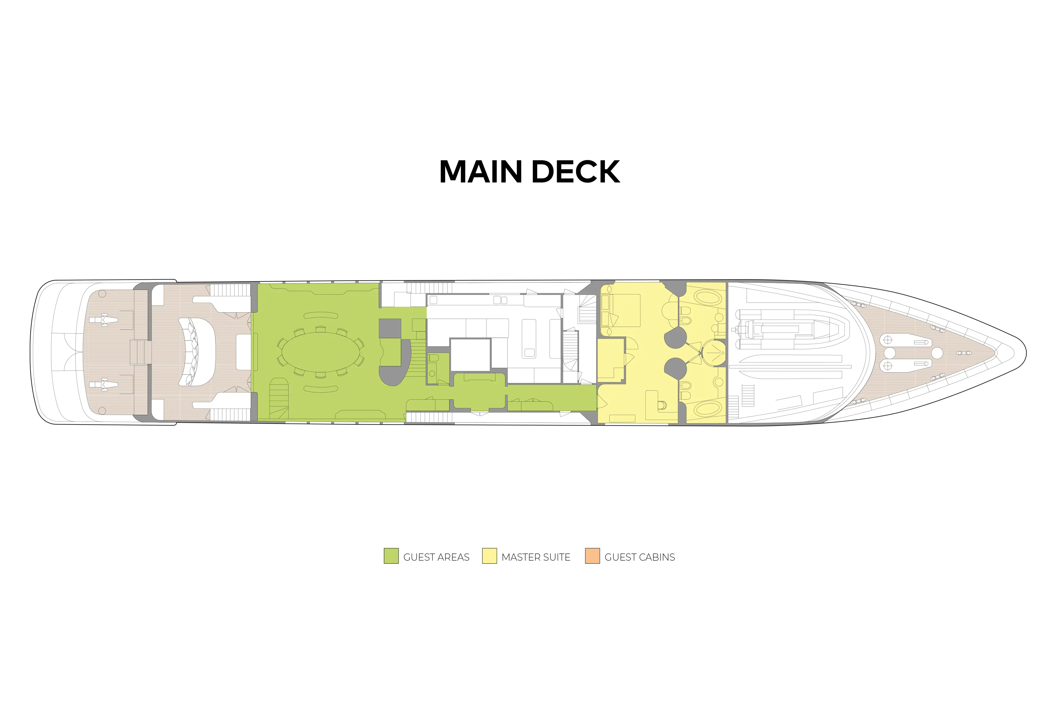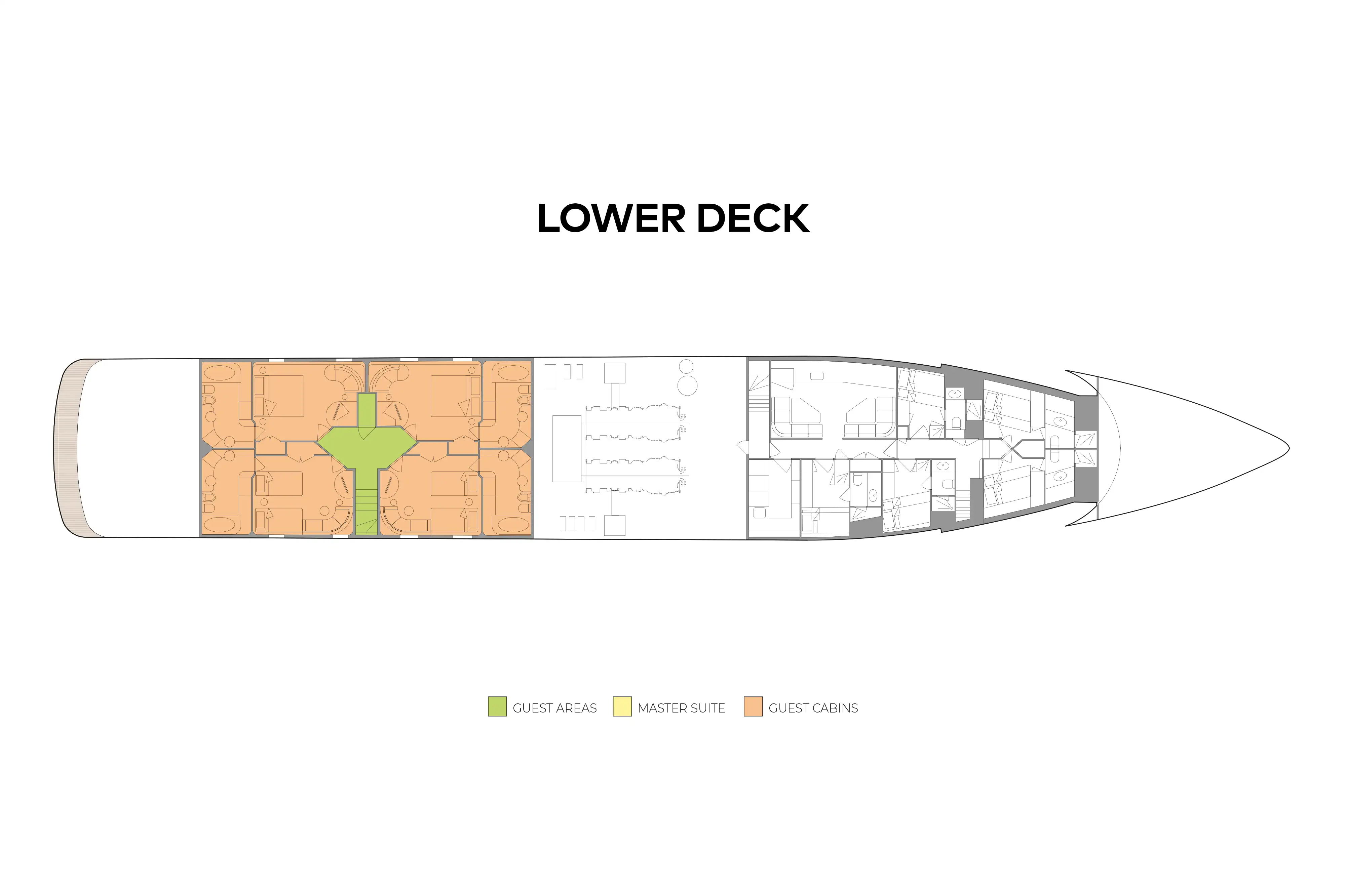 There are 5 cabins on board which sleep a total of 10 guests. The master suite on the main deck is full beam and features a private study, his and hers en suite bathrooms, a walk-in wardrobe, and large windows providing plenty of light. The four remaining cabins on the lower deck have colourful themes, and are spacious with seating areas and en suite bathrooms.