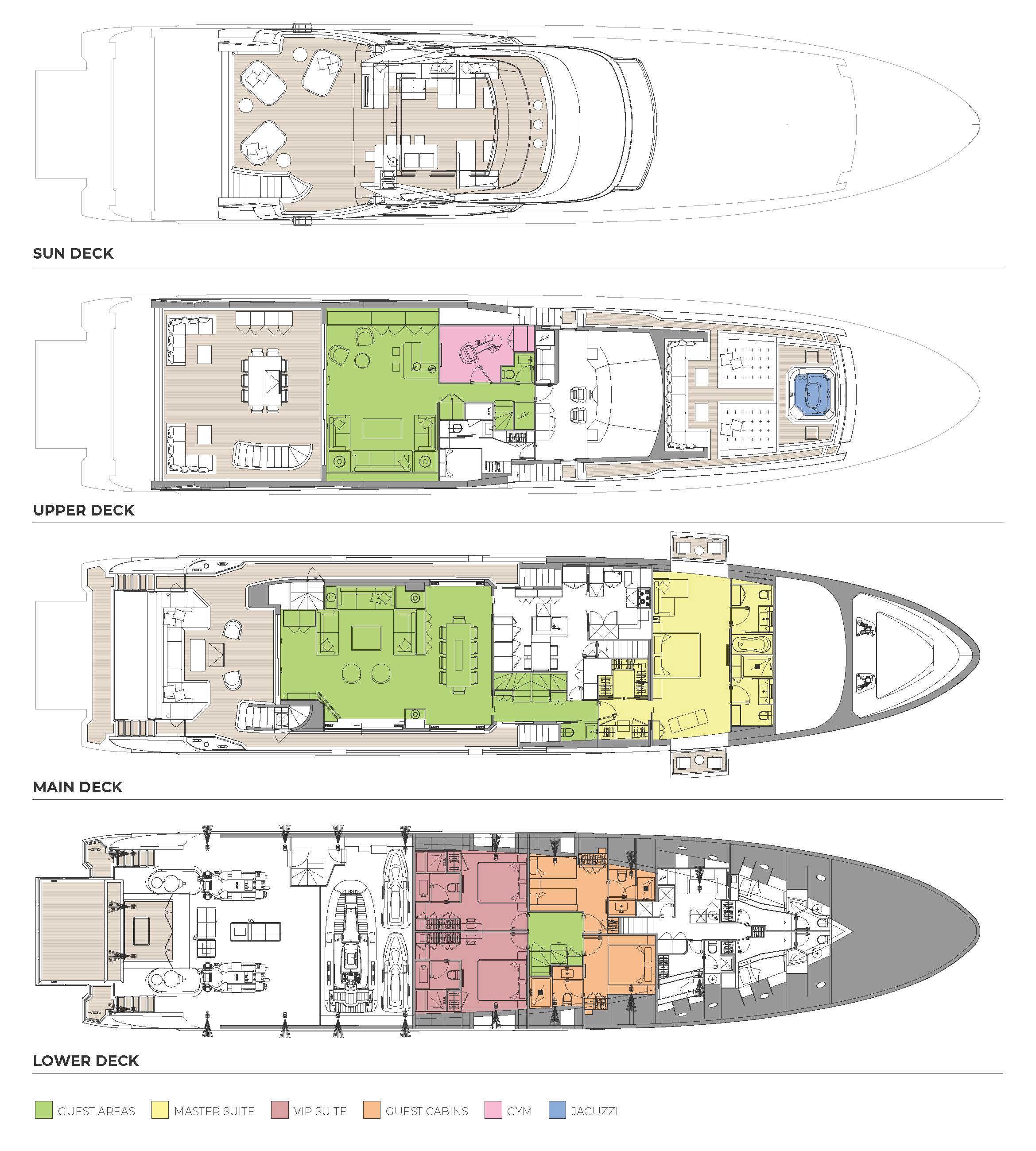 - Full-beam master cabin with his and hers en suite bathrooms, walk-in wardrobe, and fold-down balconies on both port and starboard side