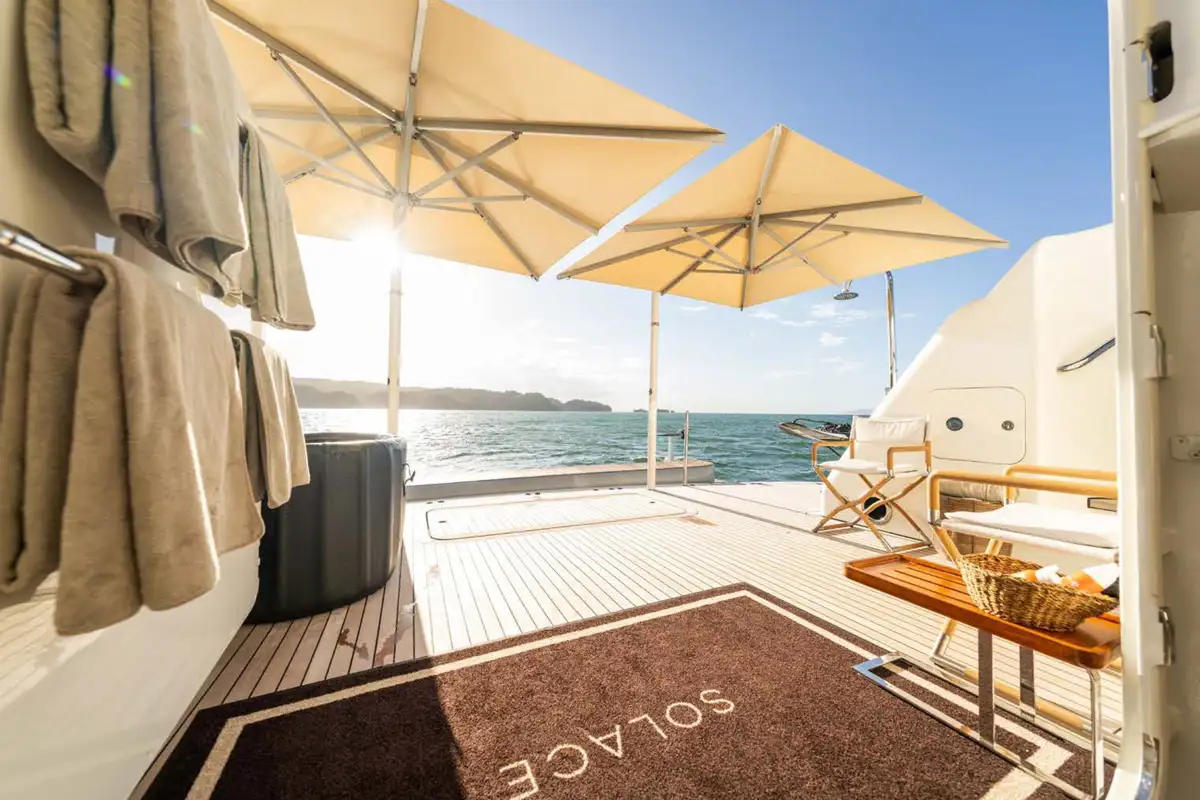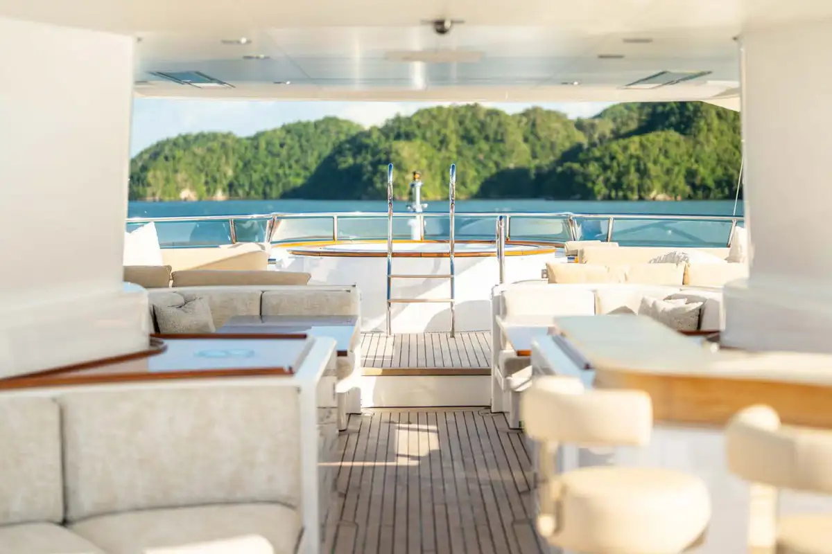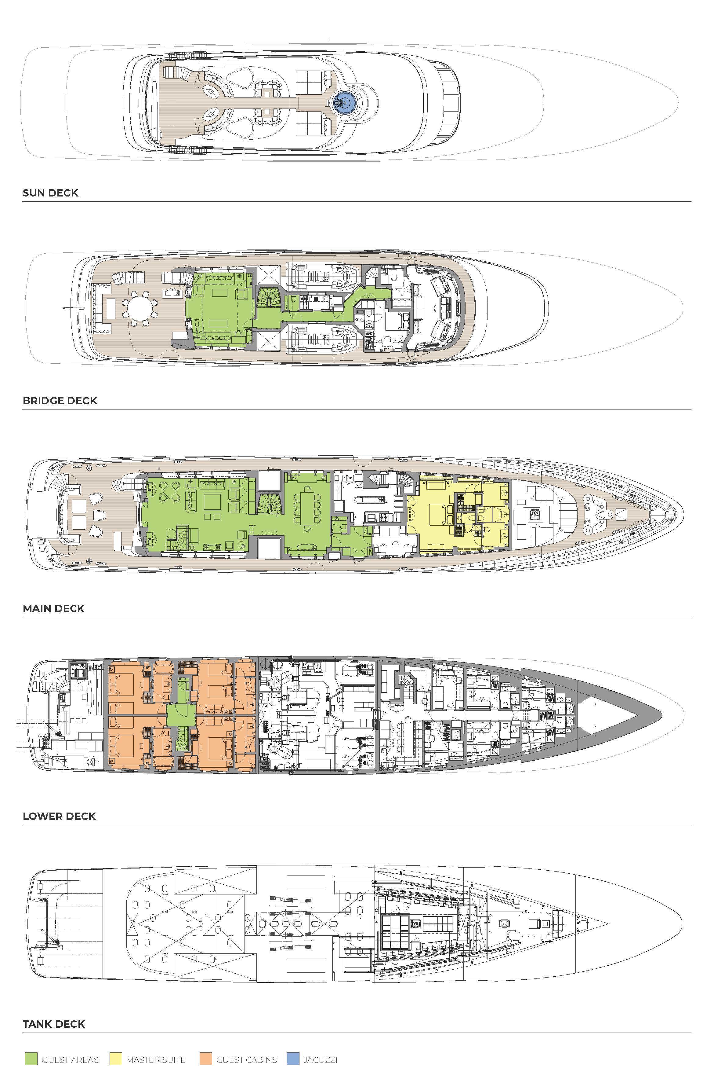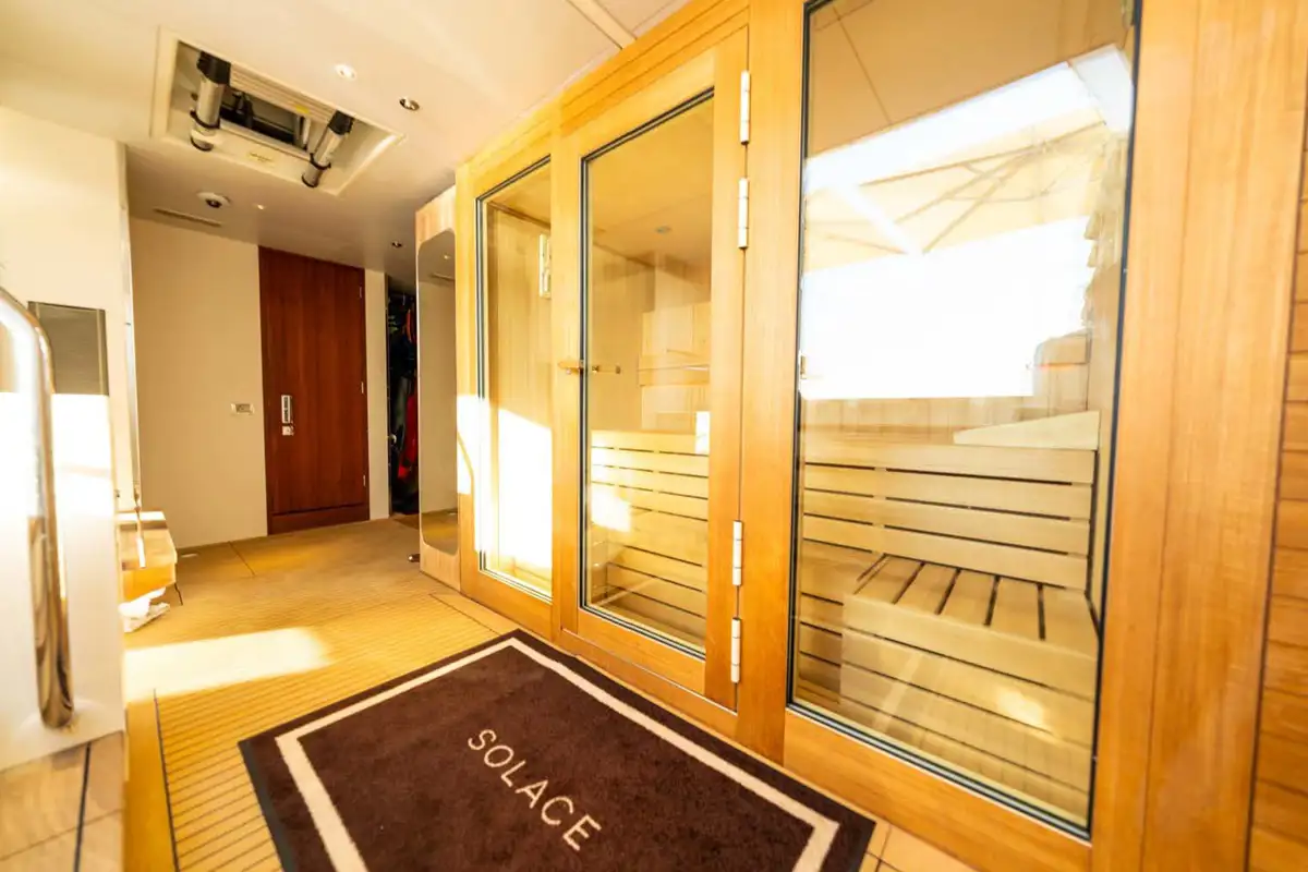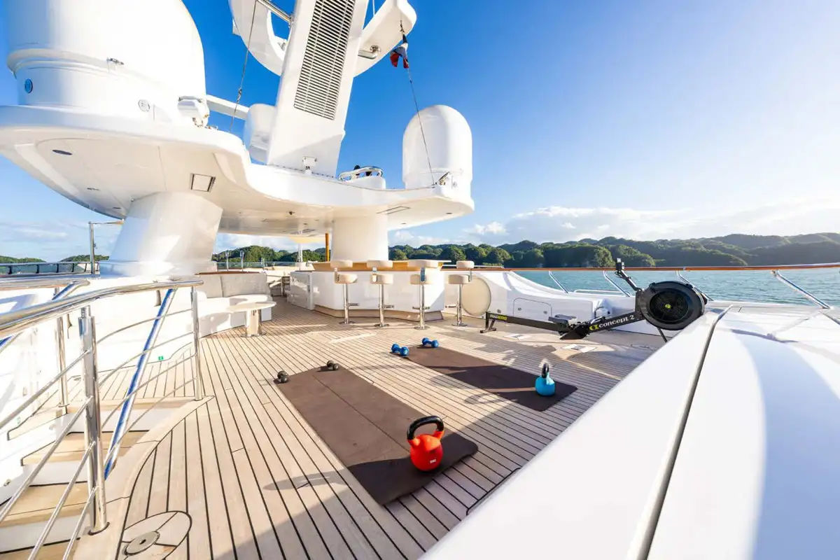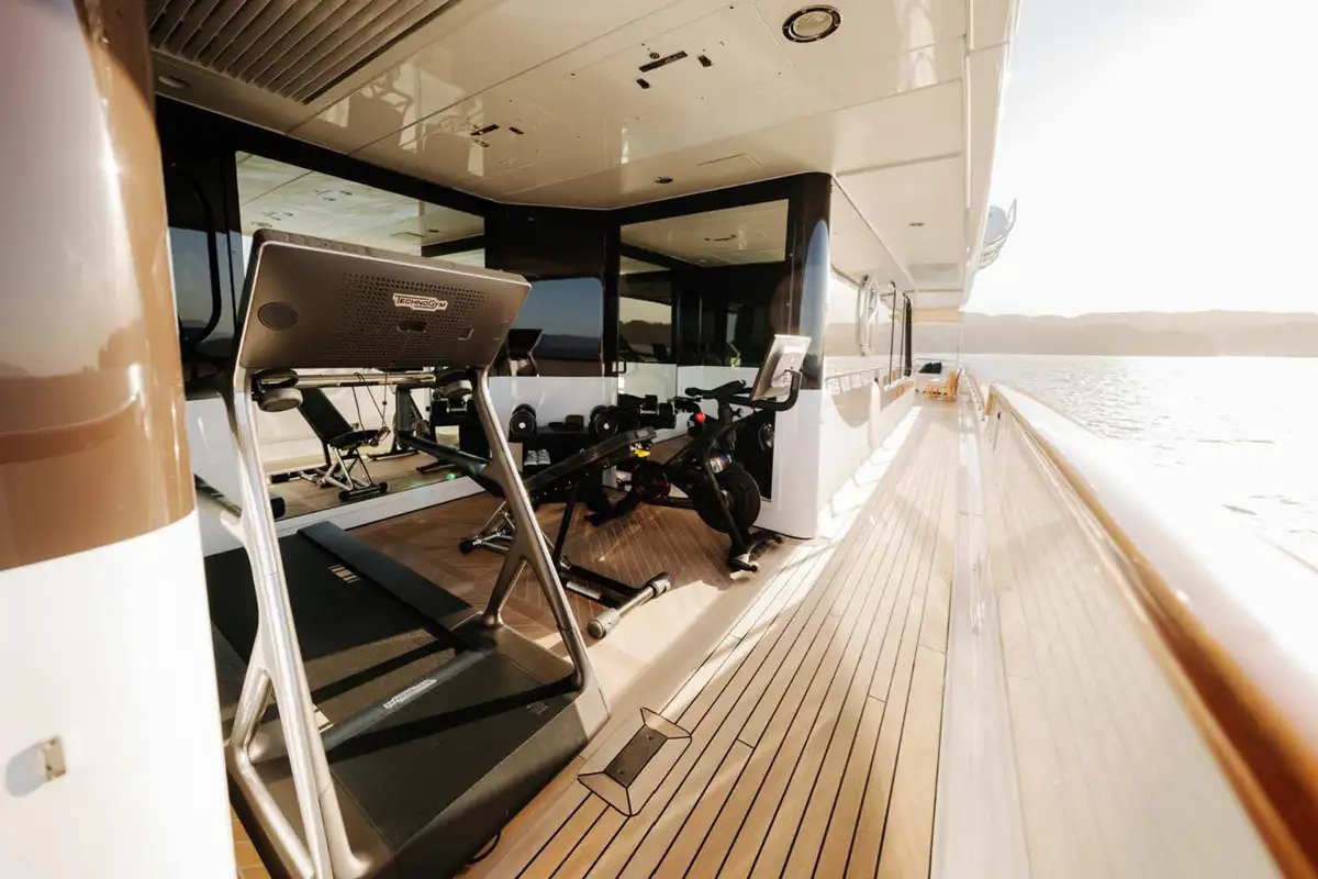 The exterior decks offer a range of lounges, with the sun deck offering several options for sunbathing alone. Both the main and bridge deck offer lounge areas, while the bridge deck is also suited for al fresco dining and features an open air gym on the port side.