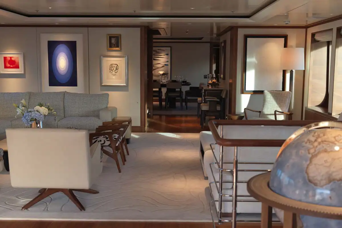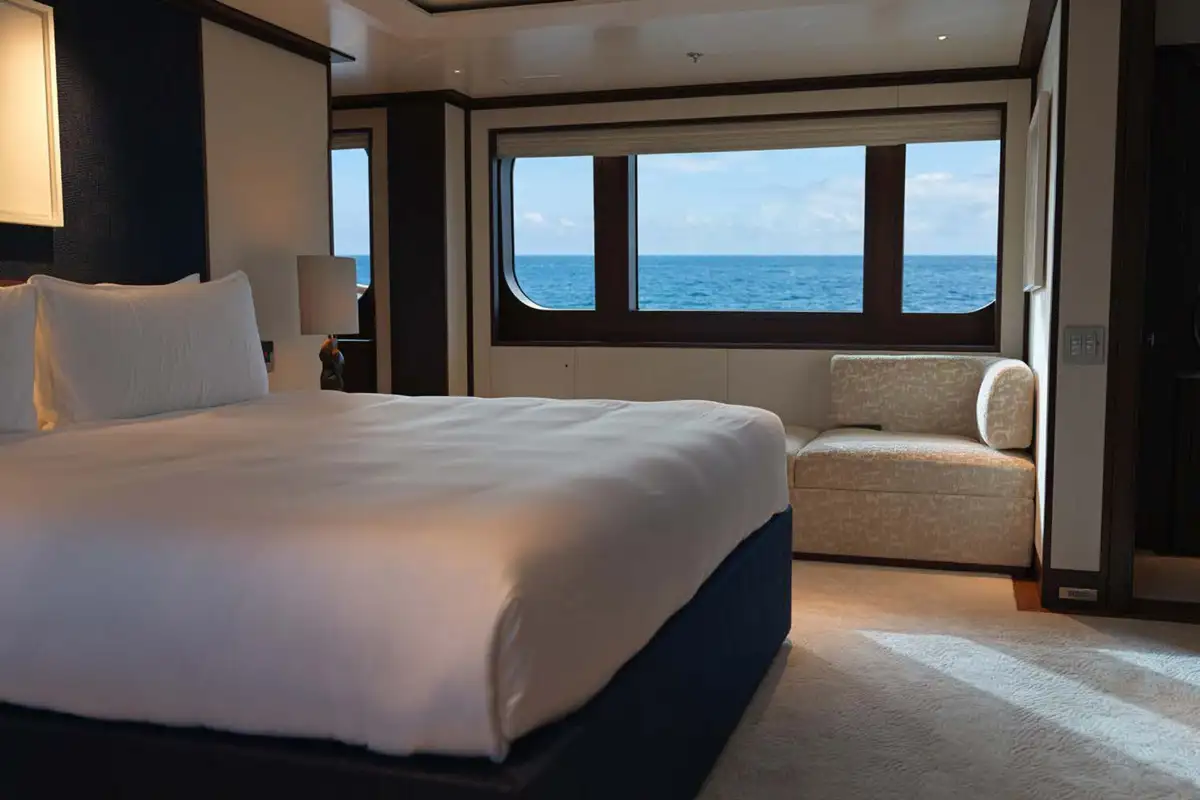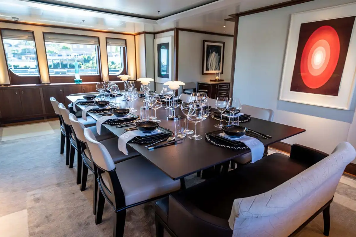 Guests can enjoy relaxing while underway in the sky lounge, or gathering over cocktails in the main saloon where they will find a soothing neutral colour pallet balanced by large windows for an airy feel. A formal dining room is also located amidships on the main deck, where guests can congregate over dinner and share stories after a long day on the water.