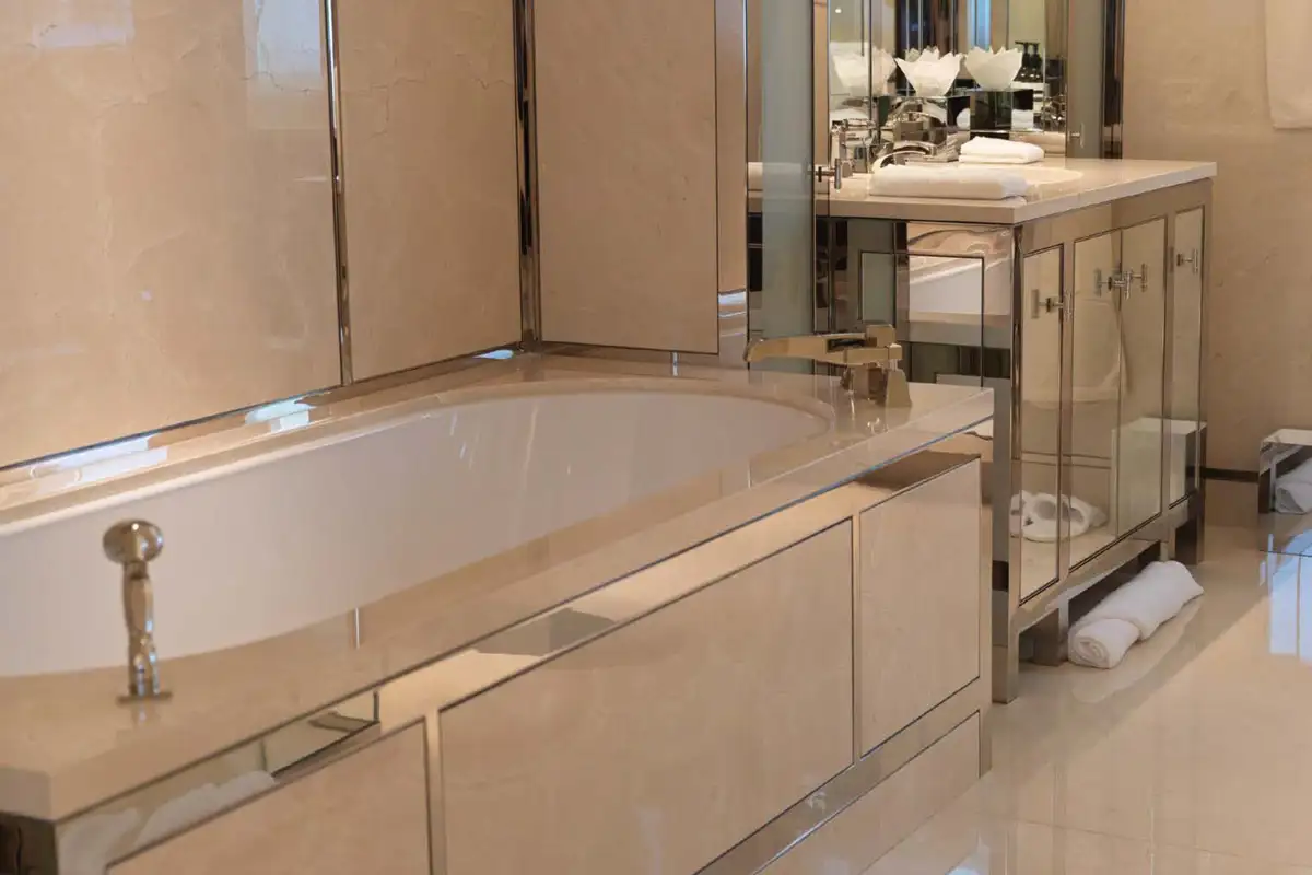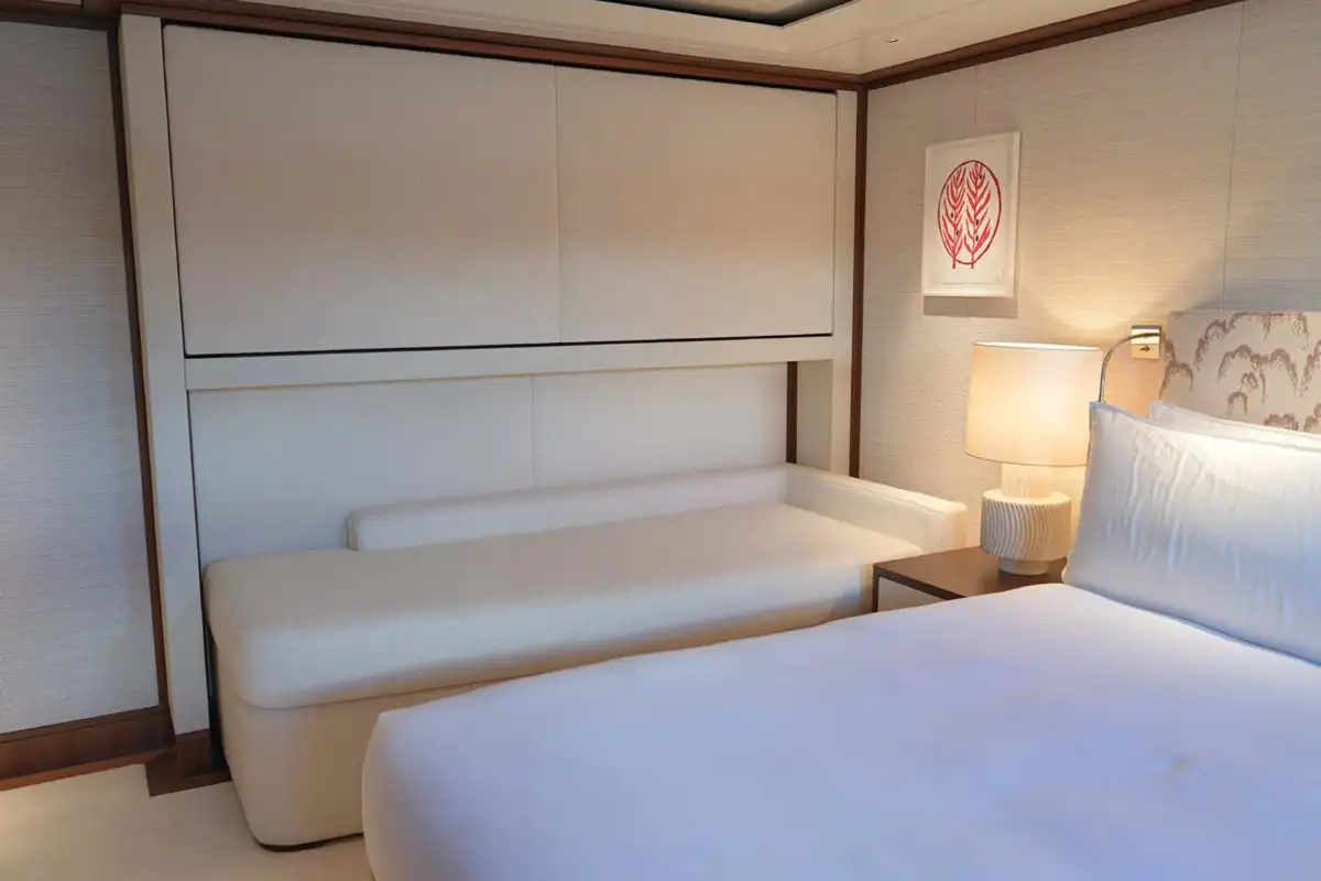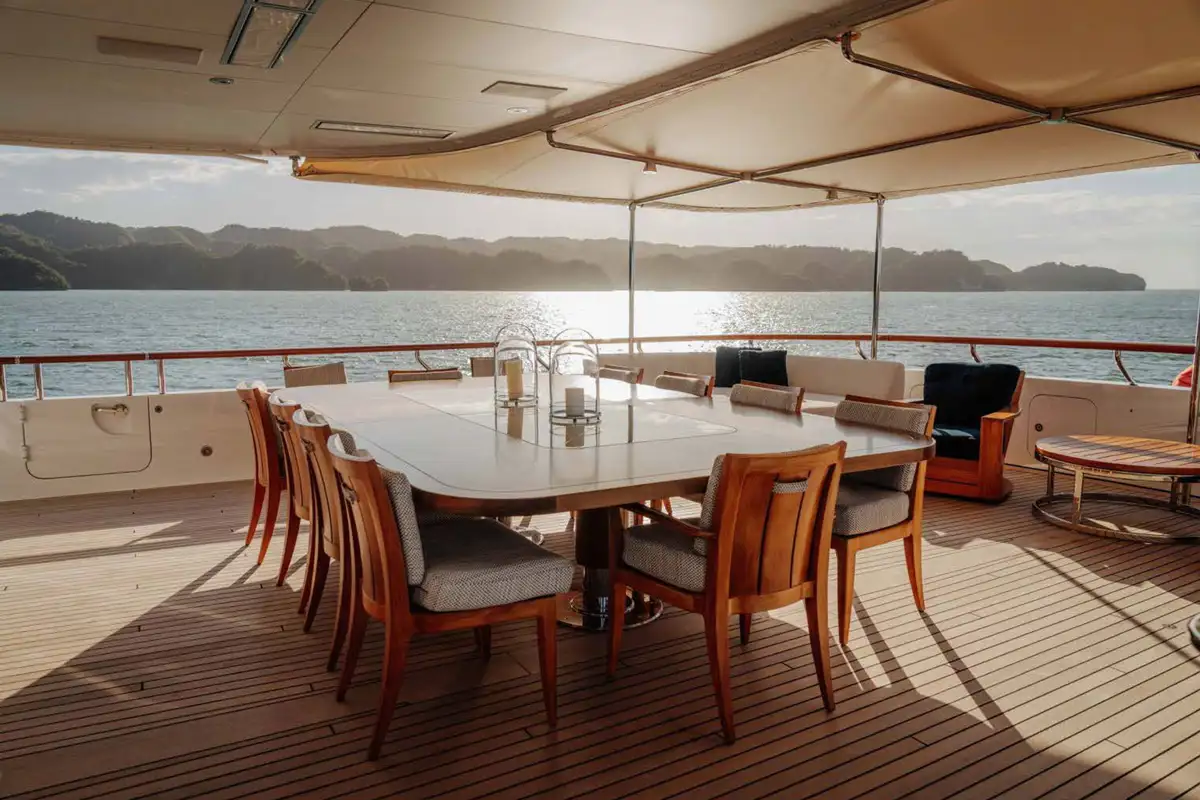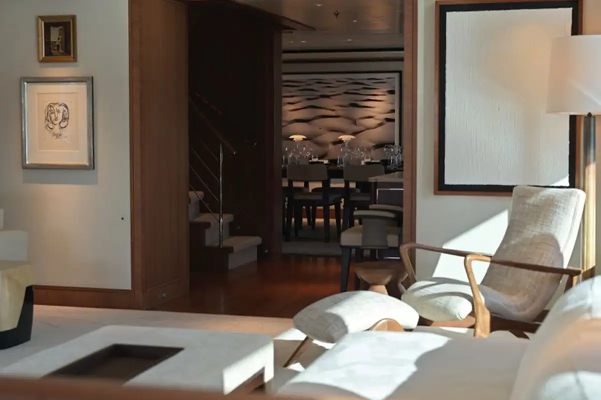 Guests can enjoy relaxing while underway in the sky lounge, or gathering over cocktails in the main saloon where they will find a soothing neutral colour pallet balanced by large windows for an airy feel. A formal dining room is also located amidships on the main deck, where guests can congregate over dinner and share stories after a long day on the water.
