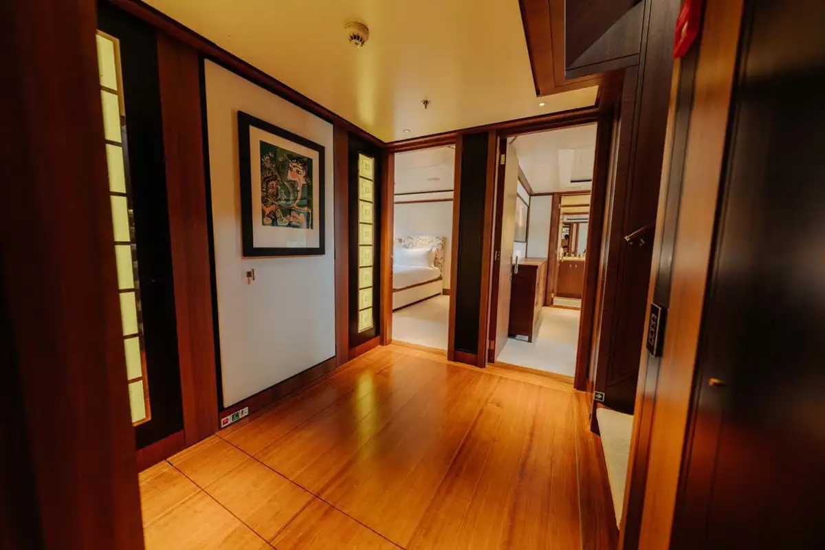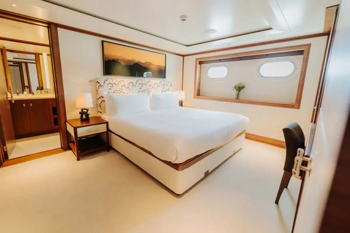 There are 5 cabins on board which sleep a total of 10 guests. The master suite on the main deck is full beam and features a comfortable seating area, private study and large windows providing plenty of light. The four remaining cabins on the lower deck have colourful themes, and are spacious with seating areas and en suite bathrooms.