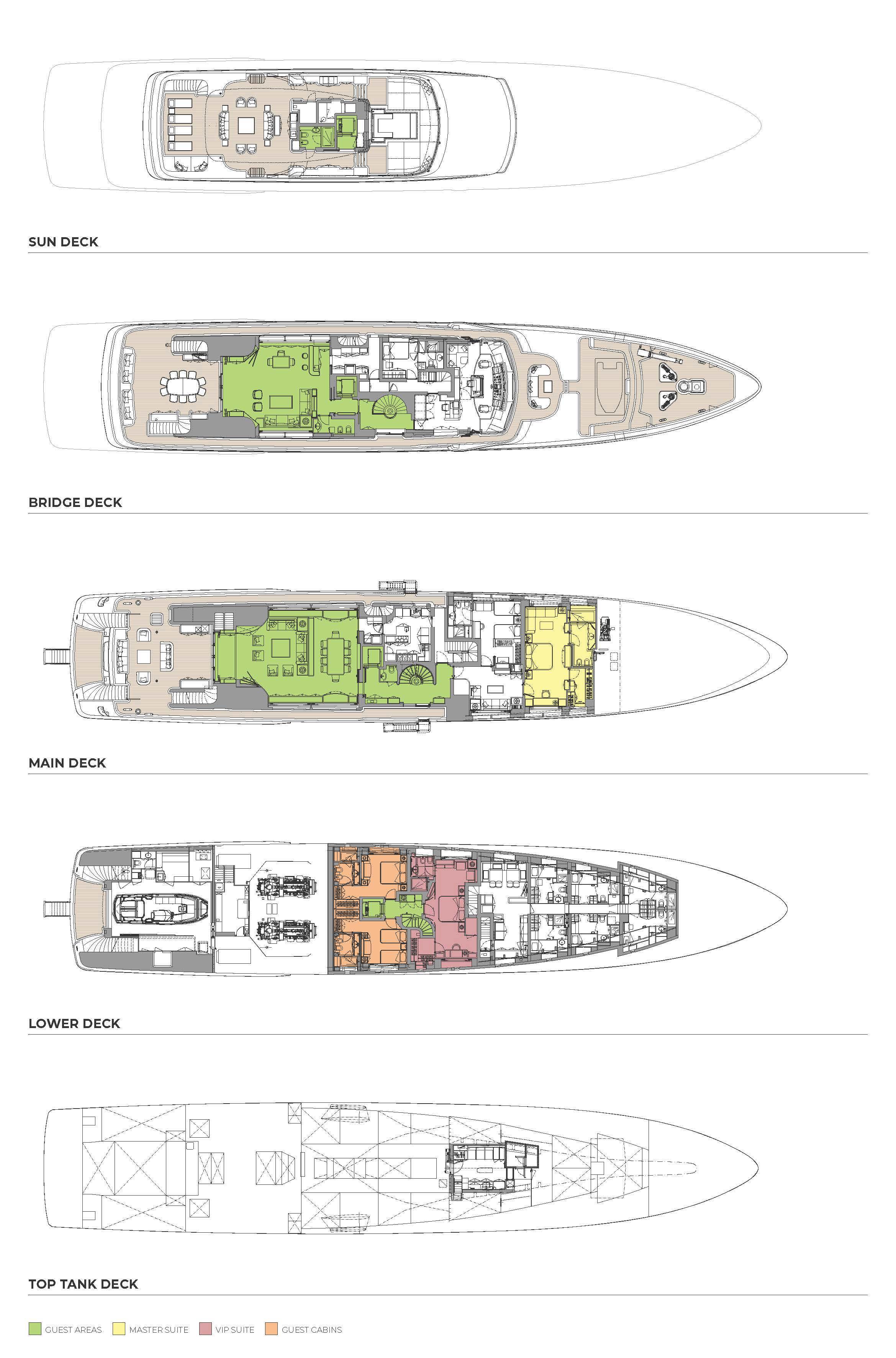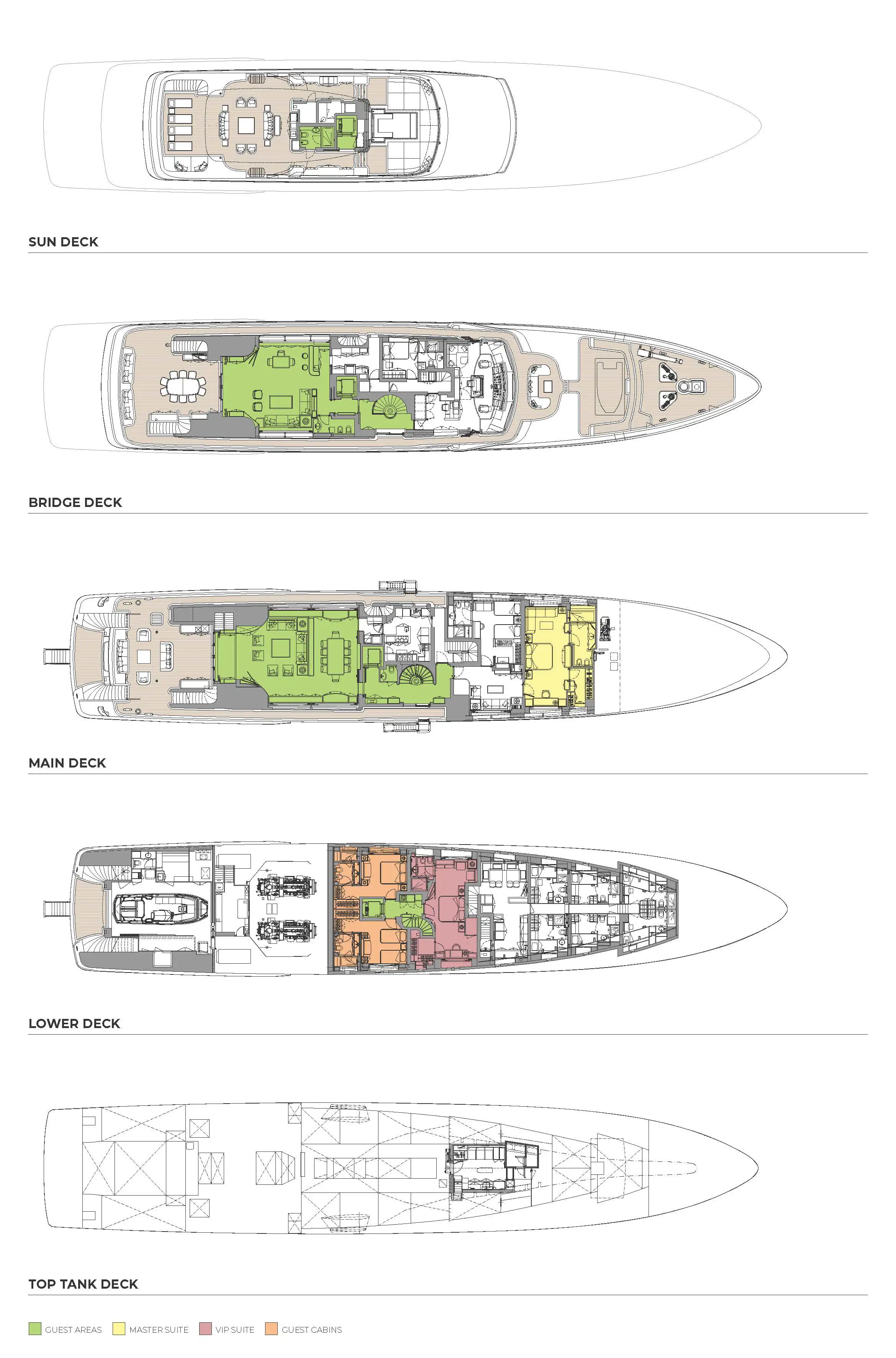 She welcomes 10 guests in five cabins. The owner's suite is forward on the main deck with a separate lounge. There is a full-beam his-and-hers bathroom forward and a walk-in wardrobe. On the port side, aft of the owner’s suite, is a VIP cabin that can be converted between double or twin berths. On the lower deck is a full-beam VIP cabin with a twin and double cabin aft.